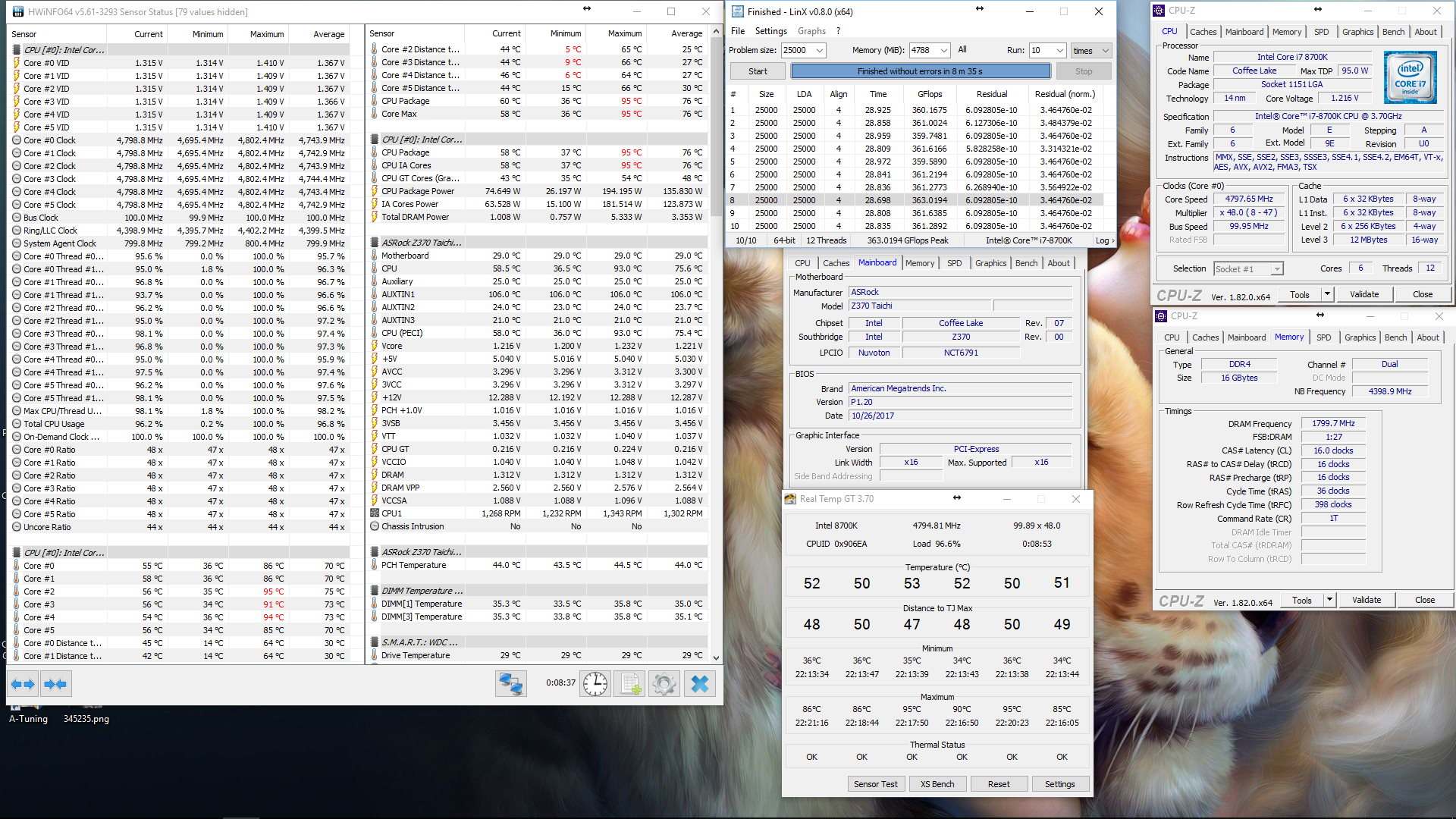 Полученный результат должен иметь следующий вид: Скриншот рабочего стола после прохождения >9 циклов (т.е. между 9 и 10 проходами). Вместе с LinX на рабочем столе должны быть развернуты CPU-Z (первая вкладка) и Core Temp, это обязательный минимум. Такой набор программ даст информацию о напряжении и температурах под нагрузкой-простоем. По желанию можете добавить другие программы, показывающие дополнительную информацию о вашей системе, например третью вкладку CPU-Z, которая покажет модель материнской платы и версию BIOS. Пример результата разгона: Mad Max, 5100 МГц (AVX 0), i7-8086K, HT-ON, Cache 4700, Vcore=1.36V, Batch L805E123, Gigabyte Z370 Aorus Gaming 7 (bios F6), Be Quiet! Dark Rock Pro 4, ЖМ под HS, Windows 10 Pro 64-bit 1809, LinX 0.9.3 64bit.