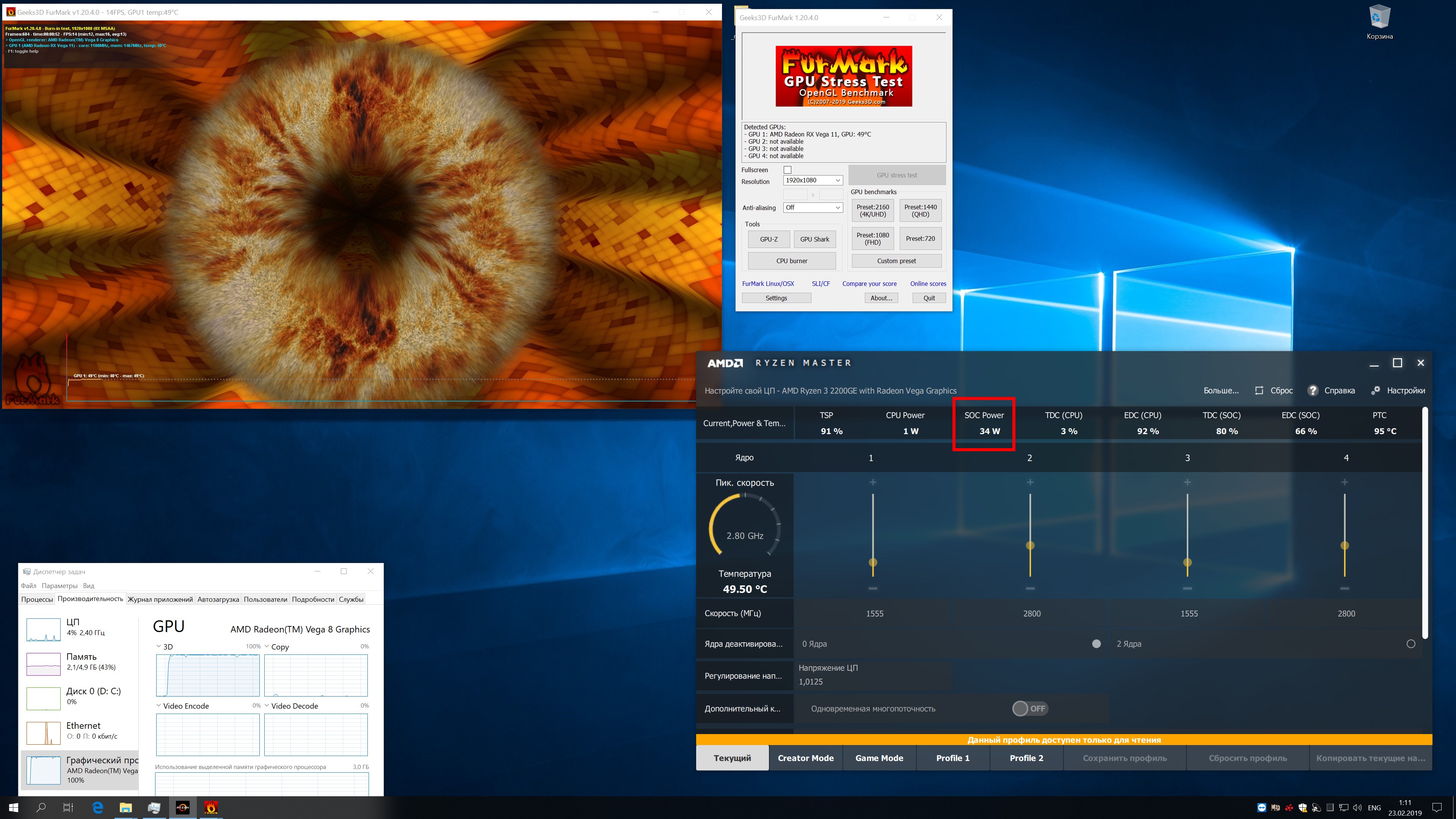 Всем привет. Вопрос владельцам R3 2200G. У меня 2200GE версия, то есть ограниченная по TDP в 35Вт. Соответственно Ryzen Master показывает вот такие результаты при загрузке только GPU (см. скрин). Какие будут цифры в SoC Power у APU c TDP в 65Вт (2200G)?