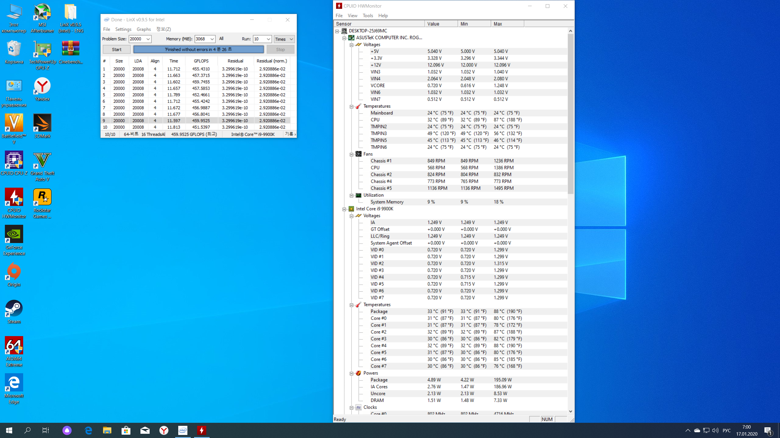 Полученный результат должен иметь следующий вид: Скриншот рабочего стола после прохождения >9 циклов (т.е. между 9 и 10 проходами). Вместе с LinX на рабочем столе должны быть развернуты CPU-Z (первая вкладка) и Core Temp, это обязательный минимум. Такой набор программ даст информацию о напряжении и температурах под нагрузкой-простоем. По желанию можете добавить другие программы, показывающие дополнительную информацию о вашей системе, например третью вкладку CPU-Z, которая покажет модель материнской платы и версию BIOS. Пример результата разгона: Mad Max, 5100 МГц (AVX 0), i7-8086K, HT-ON, Cache 4700, Vcore=1.36V, Batch L805E123, Gigabyte Z370 Aorus Gaming 7 (bios F6), Be Quiet! Dark Rock Pro 4, ЖМ под HS, Windows 10 Pro 64-bit 1809, LinX 0.9.3 64bit.