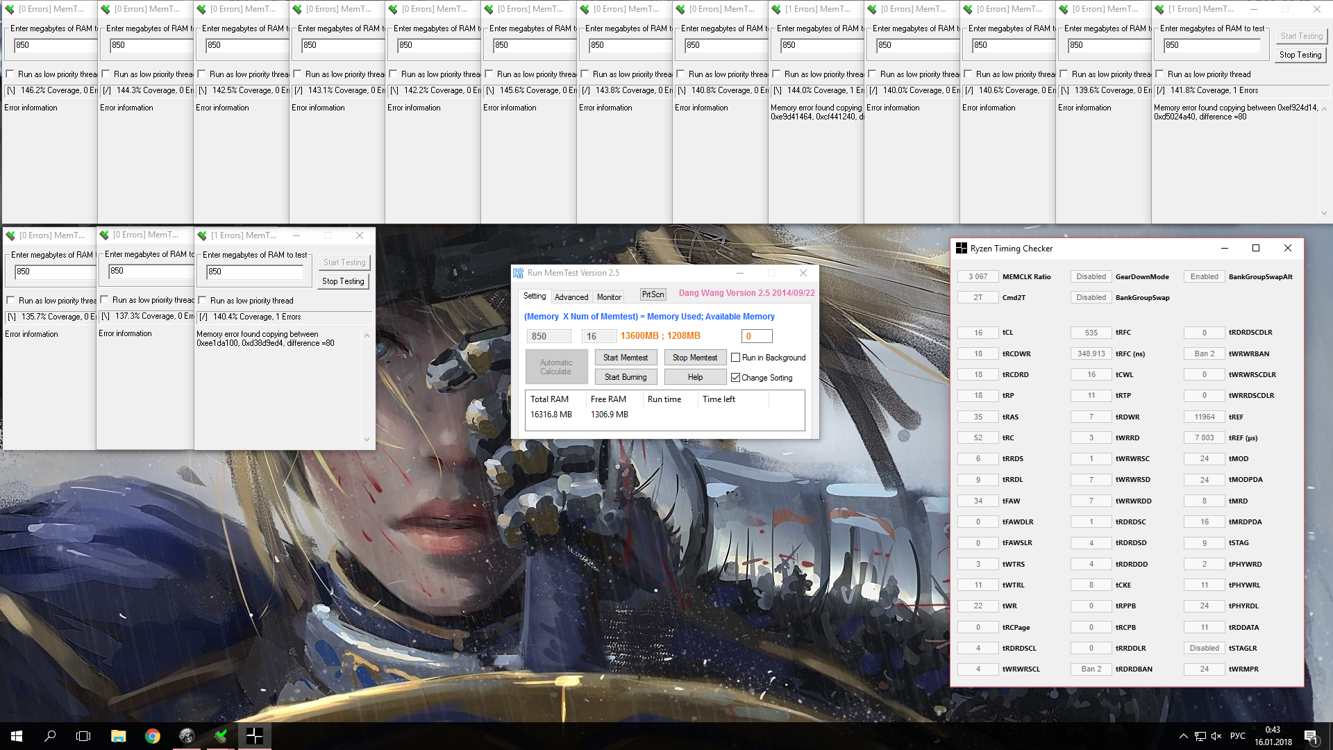 Добрый день, дорогие форумчане. Прошу помочь с вопросом разгона оперативной памяти. Что имеем: Ryzen 1700, Asrock Taichi, PV416G320C6K 8*2 3200, Chieftec 1000. Не получается запустить на частоте отличной от 2134 (от 2666, ниже не пробовал, не вижу смысла). Изначально пробовал XMP 2.0 профиль, так же пробовал использую 1.35-1.38 вольтаж на ОЗУ, vtt_ddr 0*5 вольтажа+0.1, герцовка 2800-3200, тайминги от 16 до 20, сопротивление 53-68 на rqz/5-rqz/6. Система запускается (и запускалась) с любыми из этих параметров, но мемтст держит только в стоке, в остальных случаях ловлю бсоды. На просторах Интернета нашел человека которому удалось разогнать такую ОЗУ на 16 16 16 36 64, SoC 1.1, Voltage 1,37. procODT 60, OFF, OFF, RQZ/5 но у меня тесты держит ровно так же, как и при любых настройках(4-10%), кроме 2134 (0 ошибок на 100% runmemtest 2.5). Использую 2й и 4й слоты материнки, БИОС p3.2. Подскажите, пожалуйста, в какую сторону копать?