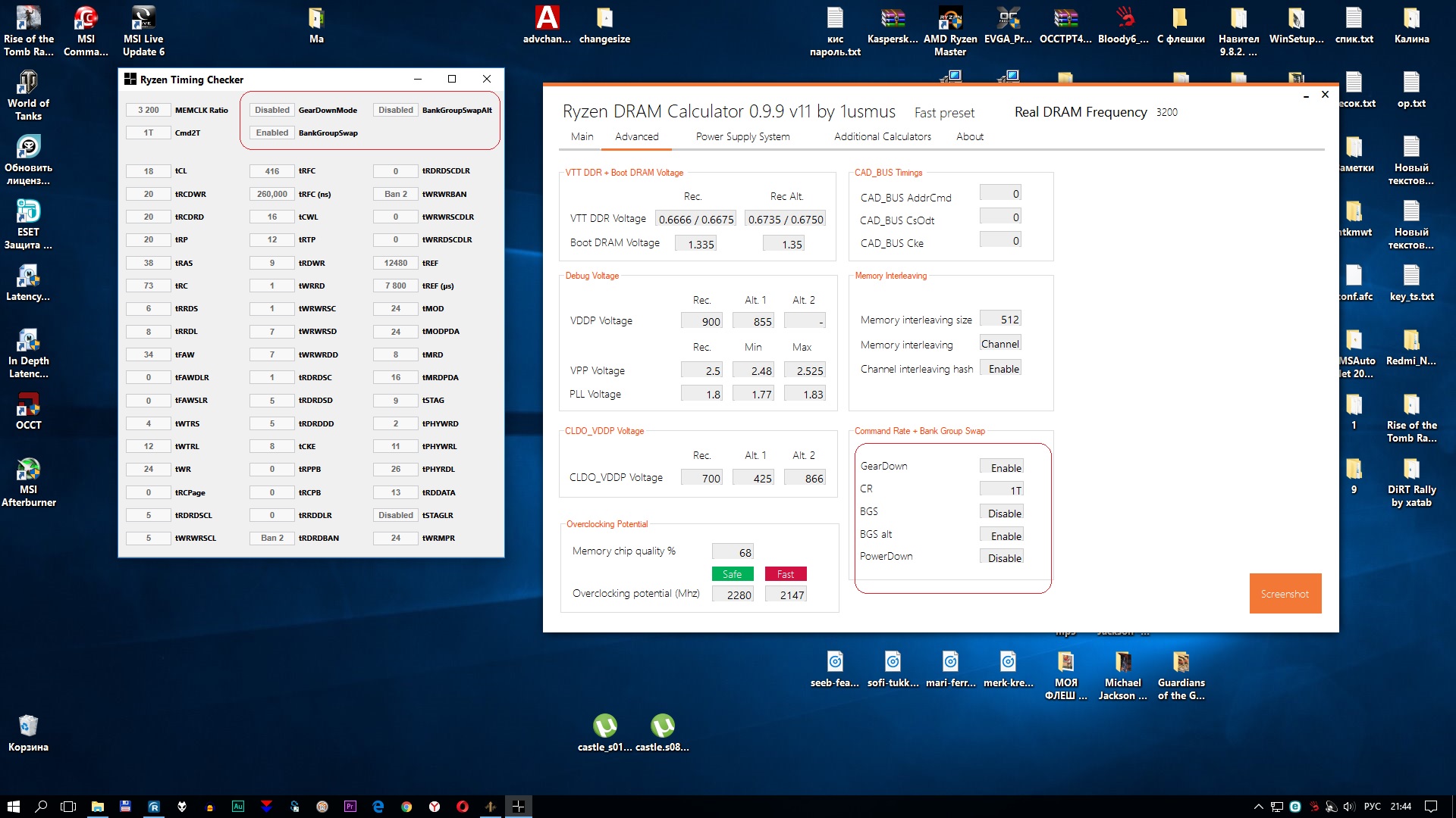 gear down mode включается когда память выше 2666mhz,можно попробовать выключить если память это нормально воспримет,тогда можно будет явно задействовать тайминг tCR=1 , bankgroupswap у меня стоят авто,тебе по калькулятору надо смотреть как их выставить для твоего типа чипов
