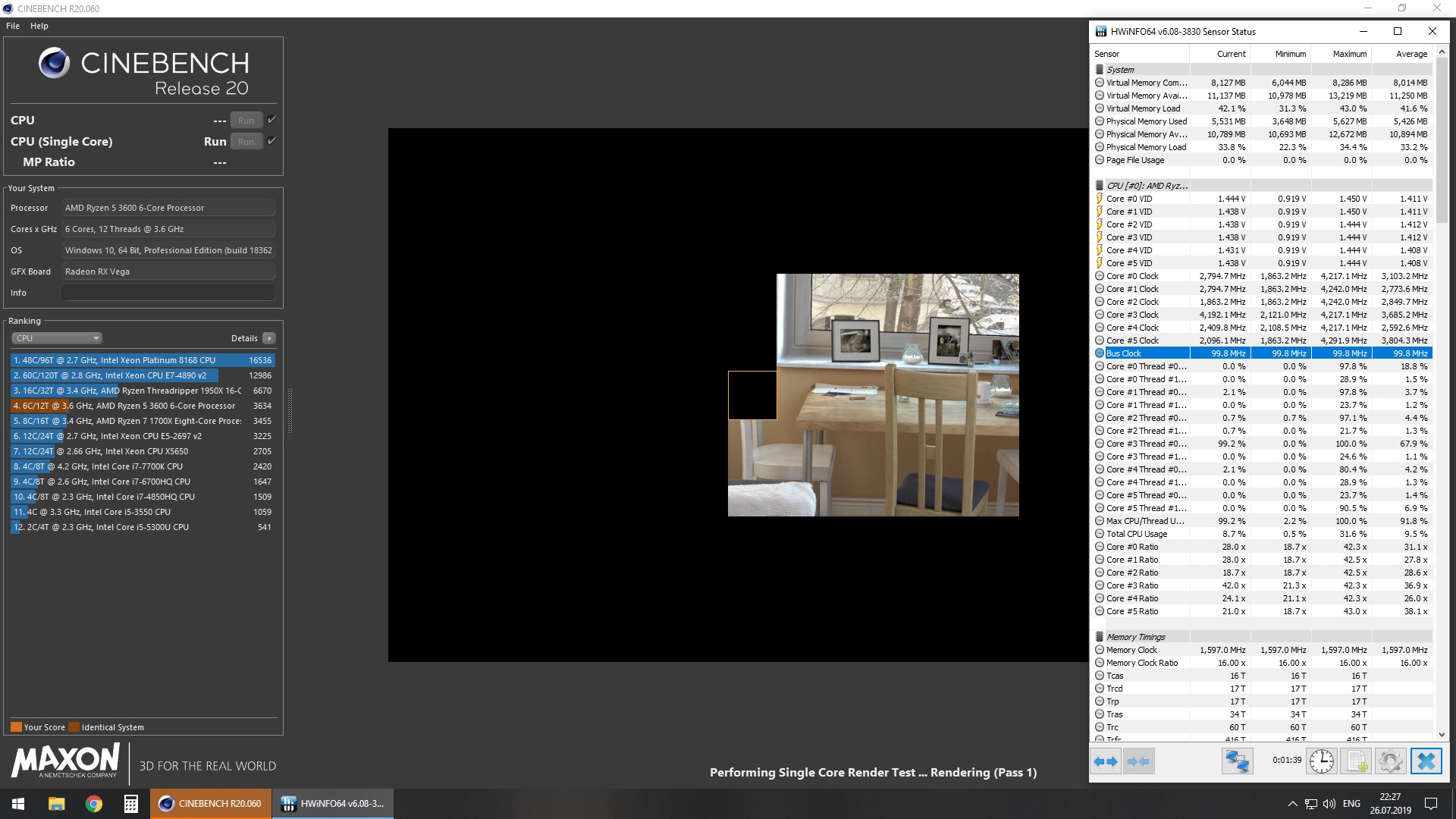 вот показатели в синибенче 20 в синглкор, я не знаю у кого там 3600 берет 4400 в PB2 прогоните такой же тест, в начале теста обнулите статистику мониторинга, и на его половине или до окончания дайте скрин с мониторинга