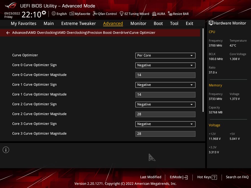 Лично я выставил сразу лимиты по максимуму что может VRM материнки и сколько может переварить охлаждение. Precision Boost Overdrive Scalar чем больше значение, тем позже и менее агрессивно процессор сбрасывает частоты после того как пропала нагрузка. Выставил на максимум. Что касается Load-Line Calibration то для всего кроме VCore выставляю в самое агрессивные значения, хотя и для VCore тоже. Precision Boost берёт во внимание показания именно мониторинга, а не запрашиваемое значение. Мониторинг материнской платы читается Precision Boost`ом через такой протокол как SVI2 TFN. Технология заключается в следующем: 1)выставляем Желаемый VCore Offset, если выставляем его в сторону увеличения, то малопоточная производительность будет выше, если в сторону уменьшения то многопоточная производительность будет выше. Под каждую настройку VCore Offset надо подправлять значения Curve Optimizer, 2)сначала для всех ядер уменьшаем Curve Optimizer, 3)запускаем скрипт, упомянутый выше, повторяем шаг номер 2, пока ни начнёт вываливаться ошибка на одном или нескольких ядрах и откатываемся на один шаг 4)запускаем после этого Cinebench R20, с большой вероятностью система просто перезагрузится, это по большей части лечится добавлением CPU PLL напряжения с 1,8V, но не превышая 1,9V, хотя от чрезмерного напряжения PLL может начаться обратный эффект и стабильность пропадёт, 5)далее начинаем настраивать Curve Optimizer для каждого ядра отдельно и проверяем стабильность как в шагах 3-4.