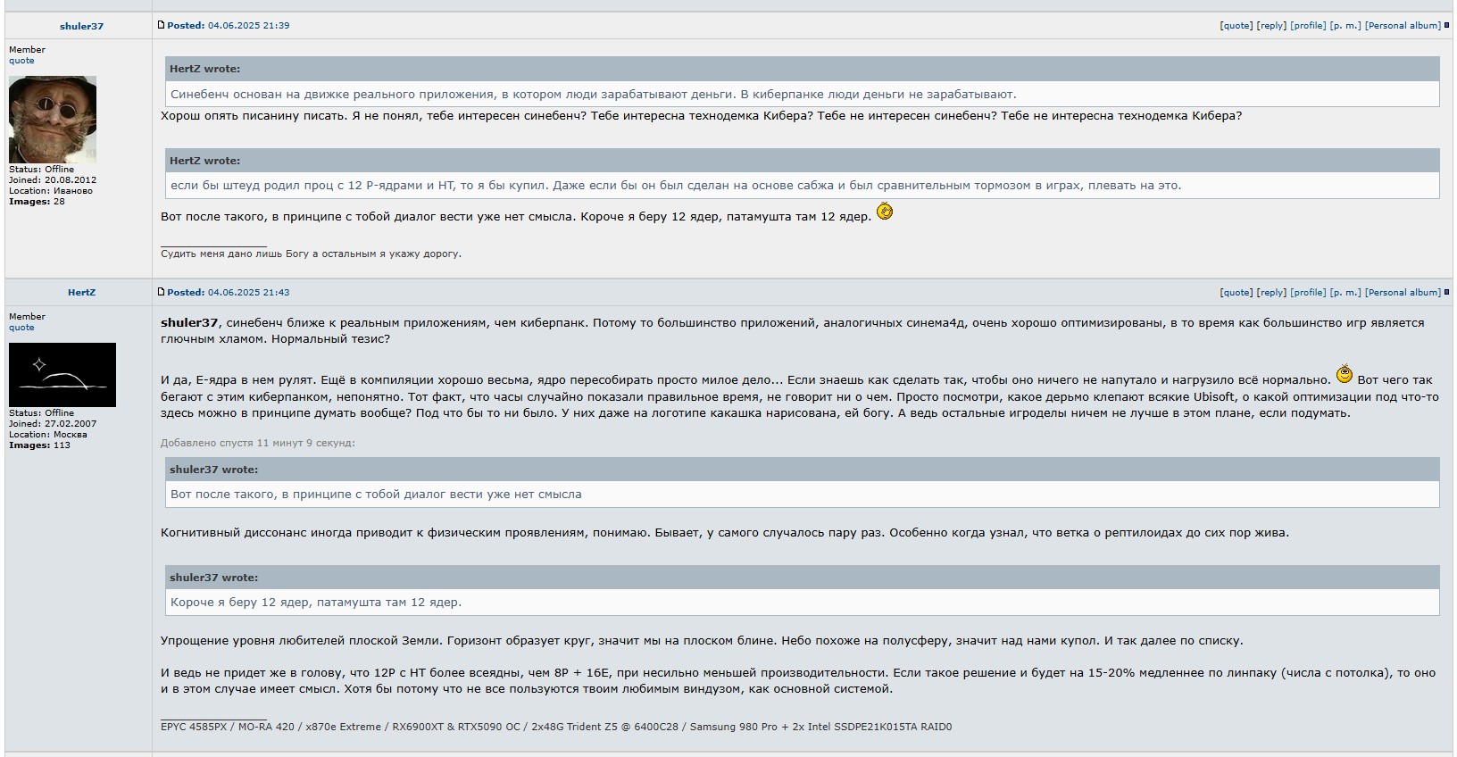 stockclock, если у человека «tuned» 14900KS оказался хуже такого чуда, то это закрывает необходимость читать любые его «экспертные» посты в дальнейшем. Потому как у «tuned» 14900KS частота будет на ~1 GHz выше и он этот недо-зион просто разнесёт, как БТР разносит фанерную хату.