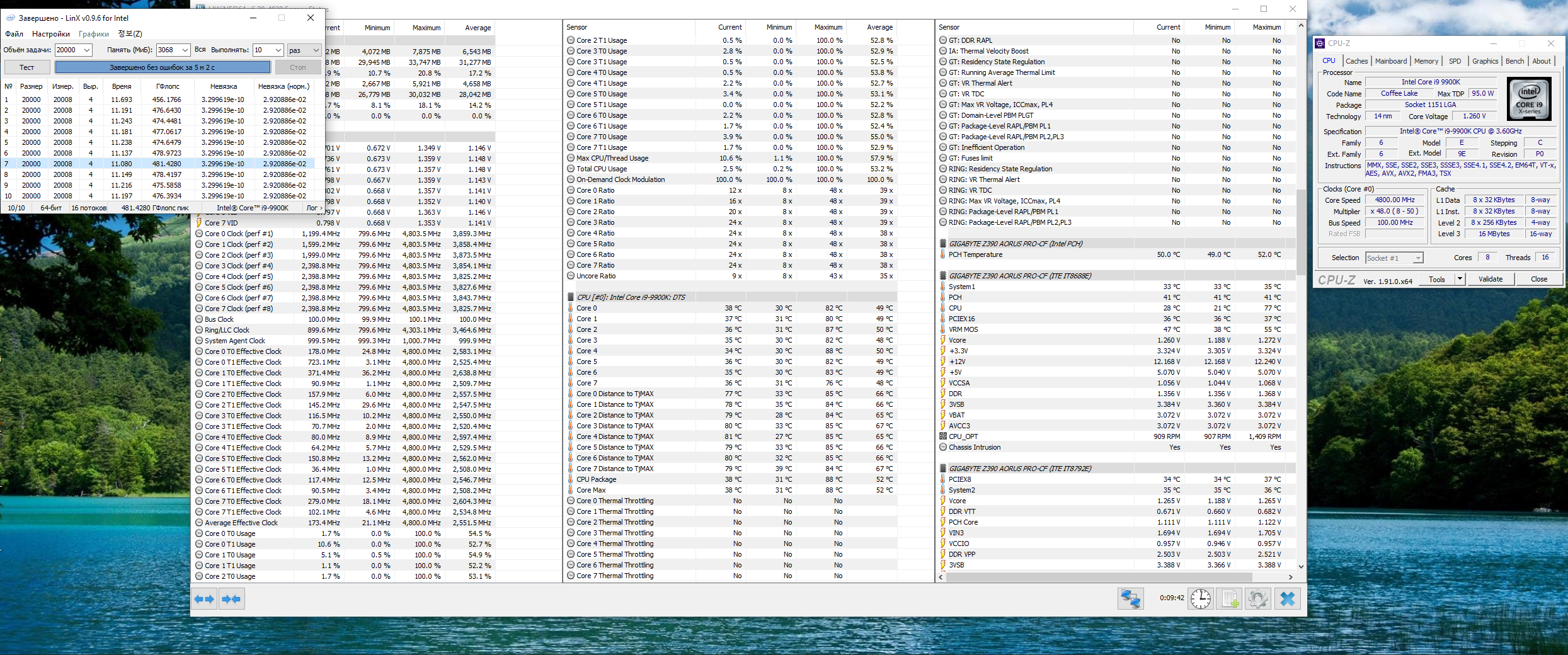 Полученный результат должен иметь следующий вид: Скриншот рабочего стола после прохождения >9 циклов (т.е. между 9 и 10 проходами). Вместе с LinX на рабочем столе должны быть развернуты CPU-Z (первая вкладка) и Core Temp, это обязательный минимум. Такой набор программ даст информацию о напряжении и температурах под нагрузкой-простоем. По желанию можете добавить другие программы, показывающие дополнительную информацию о вашей системе, например третью вкладку CPU-Z, которая покажет модель материнской платы и версию BIOS. Пример результата разгона: Mad Max, 5100 МГц (AVX 0), i7-8086K, HT-ON, Cache 4700, Vcore=1.36V, Batch L805E123, Gigabyte Z370 Aorus Gaming 7 (bios F6), Be Quiet! Dark Rock Pro 4, ЖМ под HS, Windows 10 Pro 64-bit 1809, LinX 0.9.3 64bit.