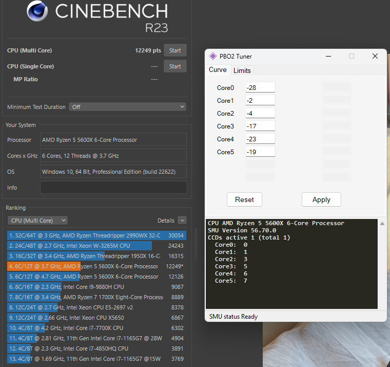 Обновил проц на 5600х, пытаюсь разобраться как работает разгон. Цель получить максимальный буст при малопоточной нагрузке. Имеется мать asus strix b450. Как я понял нужно снять лимиты ppt, tdc и edc и программой pbo2 tuner выставить курву для быстрых ядер в каждом ссх. А потом под них подгонять остальные ядра, чтобы напряжение было не выше. Это если следовать инструкции от vol2008. Может я что-то делаю не то, но результаты не впечатляют, в многопотоке частота меньше 4.6Гц, а в однопотоке 4,65. Производительность проверяю в cbr23.