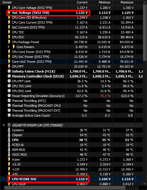 Пытаюсь стабилизировать работу системы при озу 3400, мемтесты (mem5 anta777 extreme \ universal от usmus) и бенчи проходит, линпак тоже. НО раз в 4-3 дня система может просто зависнуть (черный экран и перезагрузка) без BSOD (синих экранов), погуглив пару дней в интернете на реддите нашел то, что эта проблема распространена на зен2 и зен4 и связана с нестабильностью FCLK \ контроллера памяти \ отдельных ядер процессора. Установил VSOC 1.15 через AMD CBS (мать умеет через offset vsoc но там оно скачет жестко +-0.020мв), через HWINFO64 наблюдаю такую картину: SOC Voltage (SVI2 TFN) и CPU VCORE SOC отличаются, какому мне из них верить?
