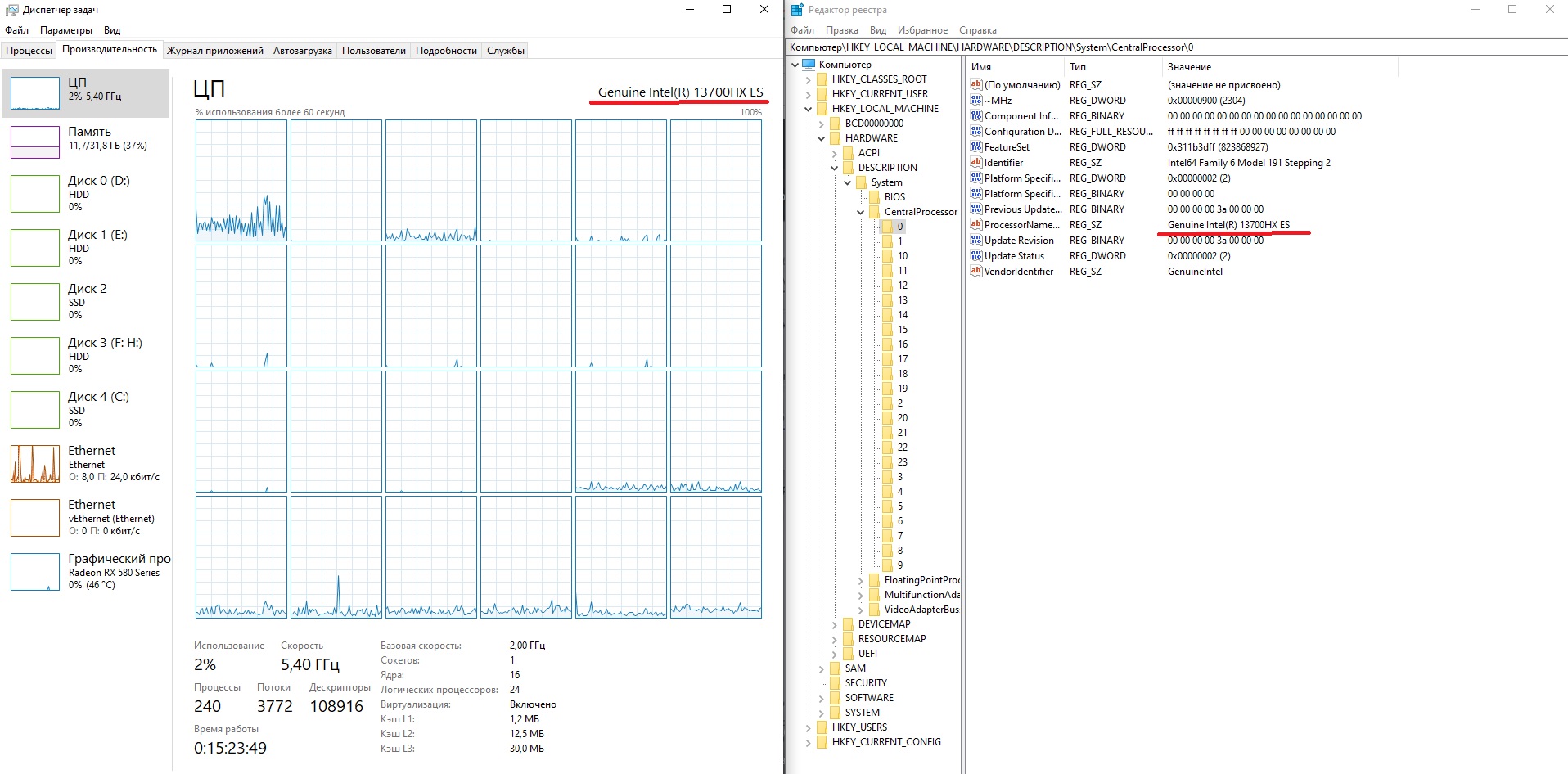 ну ожидаемо конечно, это же просто реестр винды и он обновляется при загрузке( вдруг апгрейд сделали), ну и какое нить цпу3 читает инфу не оттуда.. но как выше пишут, можно скрипт в автозагрузку, и в диспетчере будет так отображаться) у меня комп всегда включен, перезагрузки только при бсодах от разгона и подстройке биос)