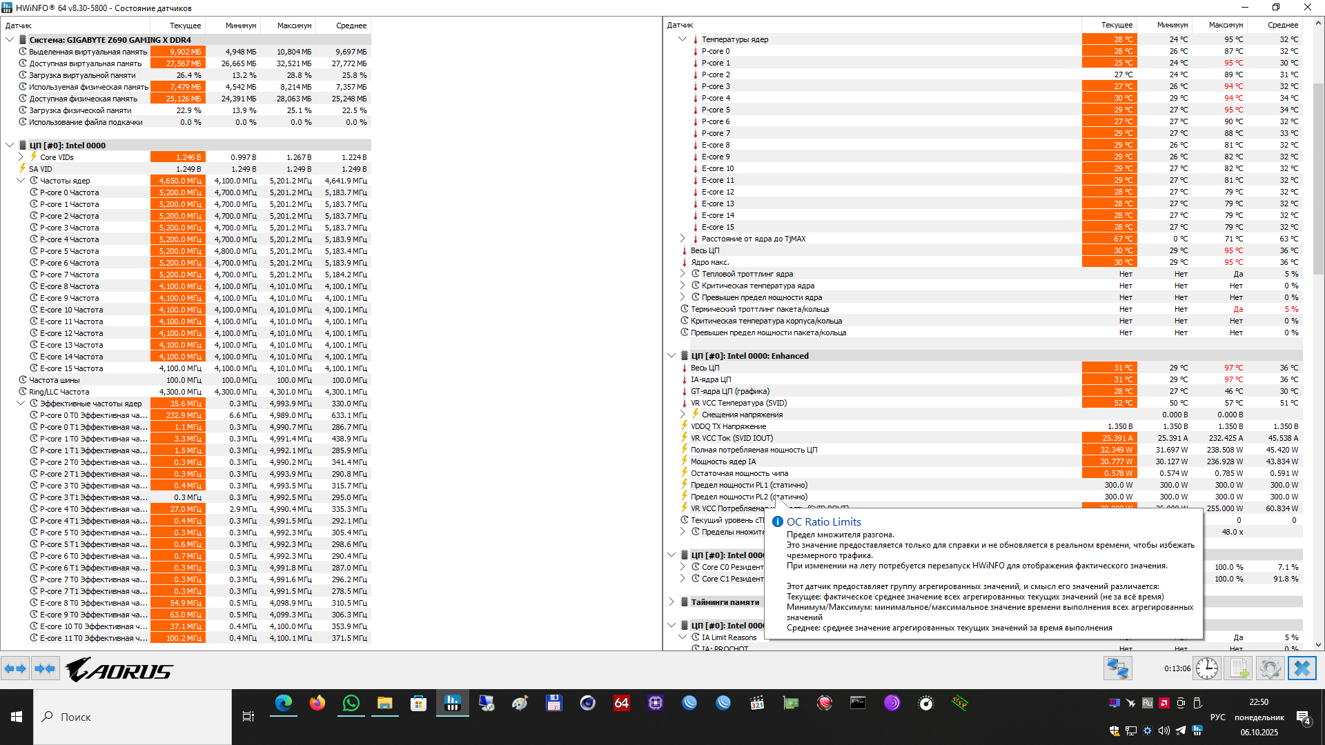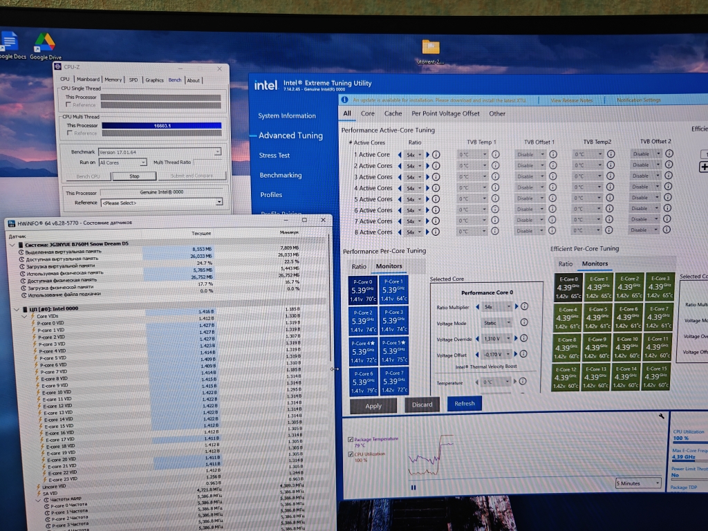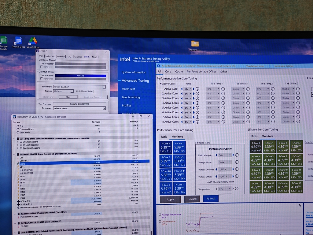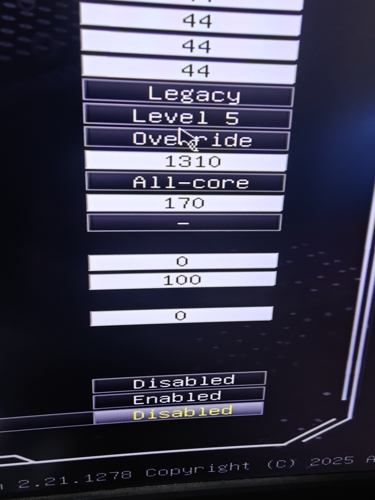 Ставлю Undervolt protection disable, AC Loadline value 80, DC Loadline value 90, VF Offset mode legacy, VRM Loadline level 4, Core Voltage Mode override, P-core Voltage Override 1310, TVB disabled, CEP disabled, IA ICC Unlimited Mode enabled, VMX disable, PL1/PL2 300W. В XTU оффсет -150. При стресс тесте комп уходит в синий экран с ошибкой clock watchdog timeout. Core VID скачет до 1.5. Если ставлю vr core limit 1300, то значение VID выравнивается, но сильно теряю в производительности.