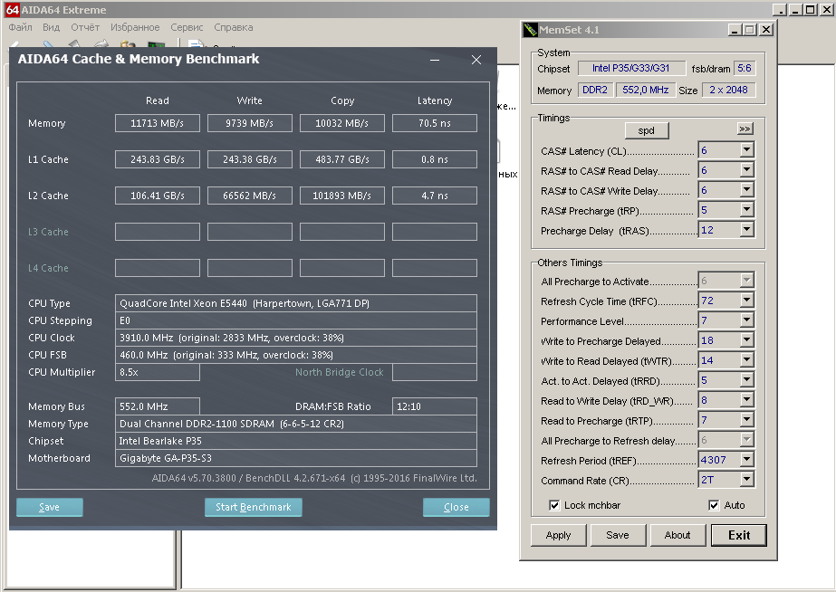 X5470 4.2GHz (420x10) 1.375V 8Gb DDR3-1680MHz strap333 9-9-9-24 PL8 Переход на X5470 дал некоторые дивиденды - на шине 420 без бубна вернулся на strap=333 и память взяла 1680MHz ("родной" для моей DDR3-1333 множитель 1:2) + немного потестил.... по сравнению с E5450 3.96GHz (440x9) и "неудобным" множителем и "неровными" таймингами strap=266 1320MHz 6-7-6-17 - повсеместный прирост ~4-6%. В Crysis 3 "добро пожаловать в джунгли" - вместо просадок до 28 fps -> 29-30 fps. Немного конечно - 1-2 fps, но в целом по игре - все идет более плавно (52-60 fps). И вообще в реальных прогах в целом разница чуствуется, более отзывчивая система, думаю еще за счет памяти на 1680 CL9 более сбалансированная.... "Страшные 120W" - в играх нагрев процессора 60-68С Noctua D14 в закрытом корпусе при 90-100% загруженной GTX660..... Намного меньше шаманских танцев чтобы выйти на стабильные 4-4.2GHz. Простора для маневров с настройками на-а-амного больше.... Я очень доволен апгрейдом...