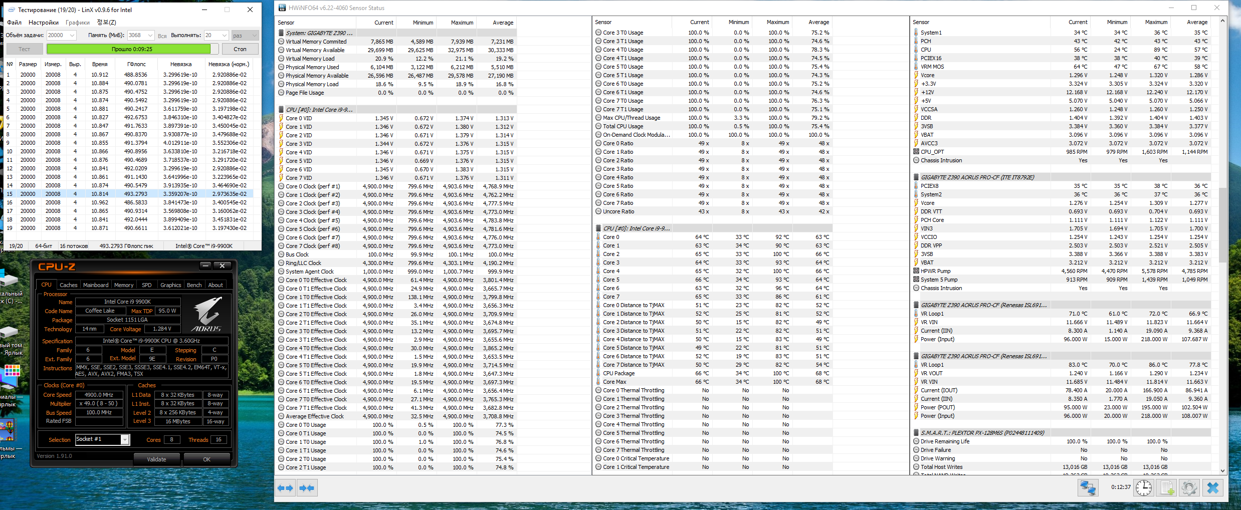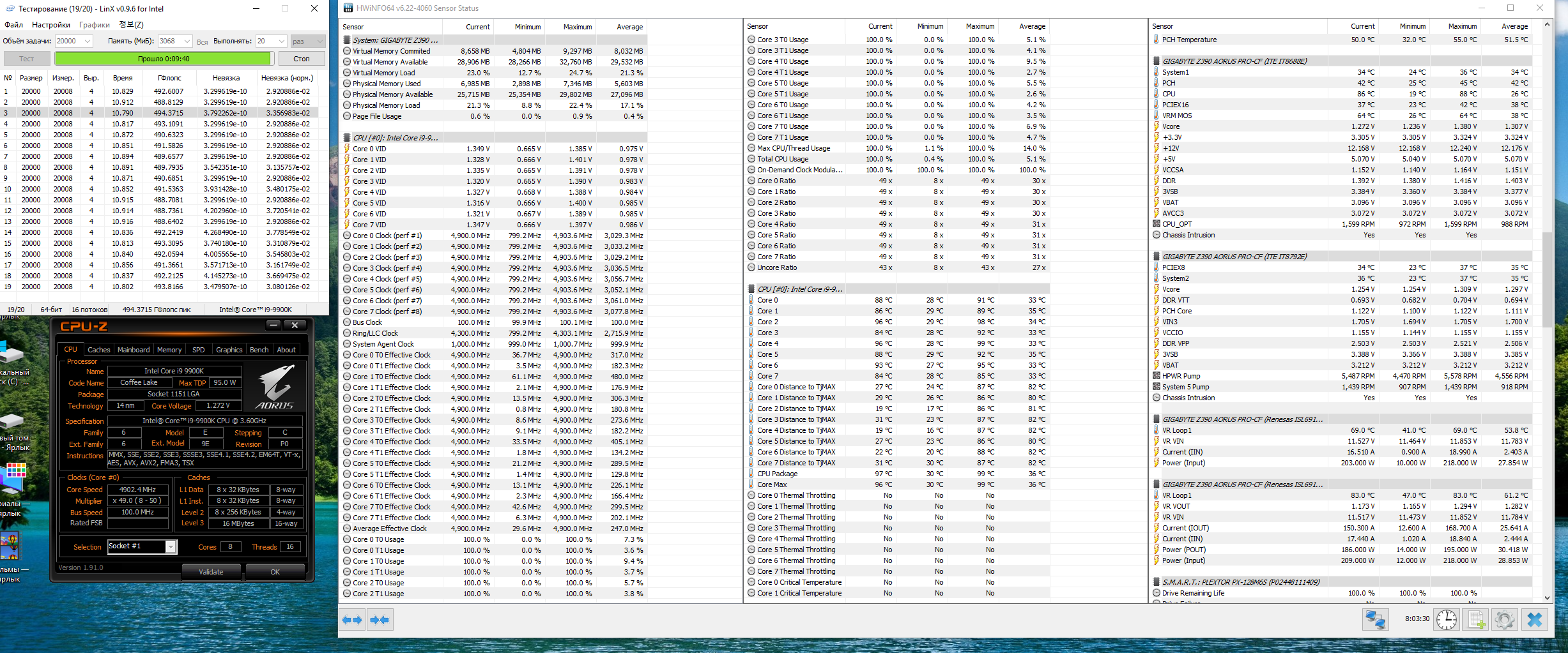 Полученный результат должен иметь следующий вид: Скриншот рабочего стола после прохождения >9 циклов (т.е. между 9 и 10 проходами). Вместе с LinX на рабочем столе должны быть развернуты CPU-Z (первая вкладка) и Core Temp, это обязательный минимум. Такой набор программ даст информацию о напряжении и температурах под нагрузкой-простоем. По желанию можете добавить другие программы, показывающие дополнительную информацию о вашей системе, например третью вкладку CPU-Z, которая покажет модель материнской платы и версию BIOS. Пример результата разгона: Mad Max, 5100 МГц (AVX 0), i7-8086K, HT-ON, Cache 4700, Vcore=1.36V, Batch L805E123, Gigabyte Z370 Aorus Gaming 7 (bios F6), Be Quiet! Dark Rock Pro 4, ЖМ под HS, Windows 10 Pro 64-bit 1809, LinX 0.9.3 64bit.