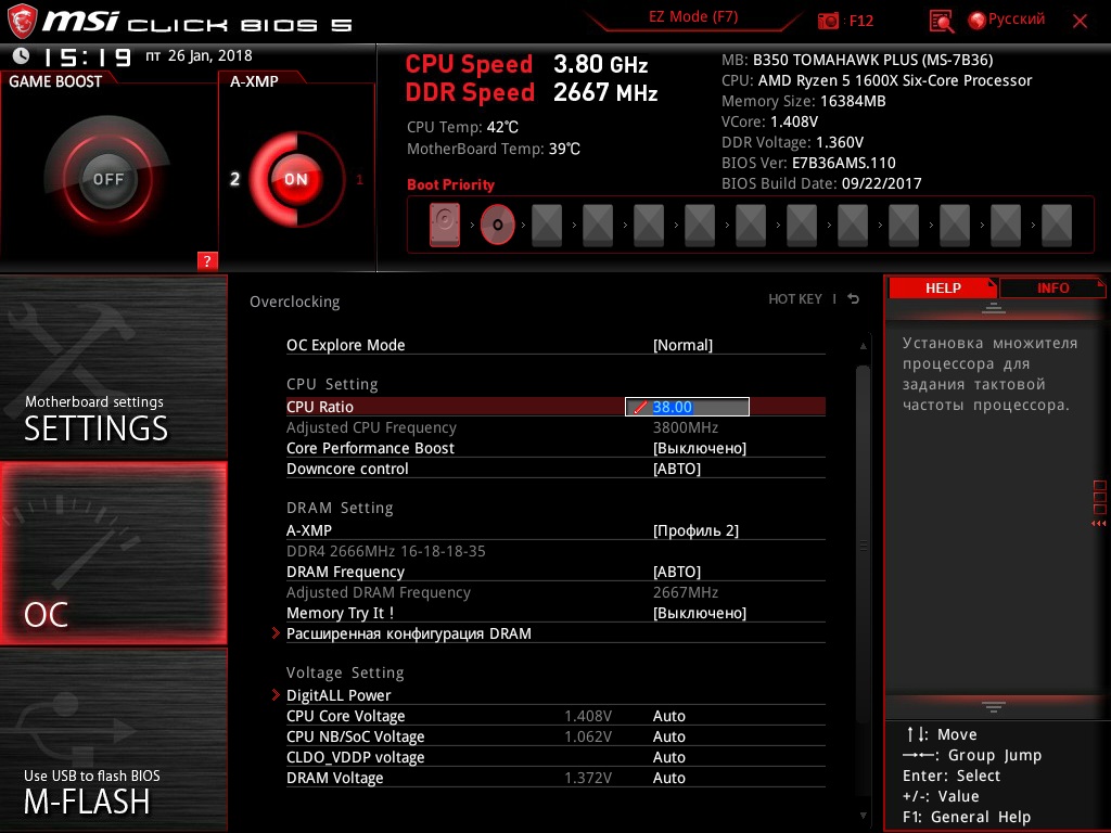 - Обычно поставляется в коробке с системой охлаждения Wraith Spire RGB (это круглая конструкция из целого куска алюминия с медной вставкой-испарительной камерой в основании и вентилятором с кольцом разноцветной подсветки, крепится к задней пластине разъёма AM4 четырьмя винтами). - Штатно имеет базовую частоту 3.0ГГц, частоту 3.2ГГц (технология Turbo Boost) при обычной многопоточной нагрузке (Blender n-cores render) и 3.75ГГц (технологии Precision Boost и XFR) при однопоточной нагрузке (Cinebench R15 single core). - Штатное напряжение питания 1.1875В. Может возрастать до 1.3В на отдельных ядрах во время работы Precision Boost и XFR. - Очень энергоэффективный, требования к СО (TDP) - всего 65W. Энергопотребление порядка 10Вт в простое и 85Вт в обычной многопоточной нагрузке (Blender n-cores render).