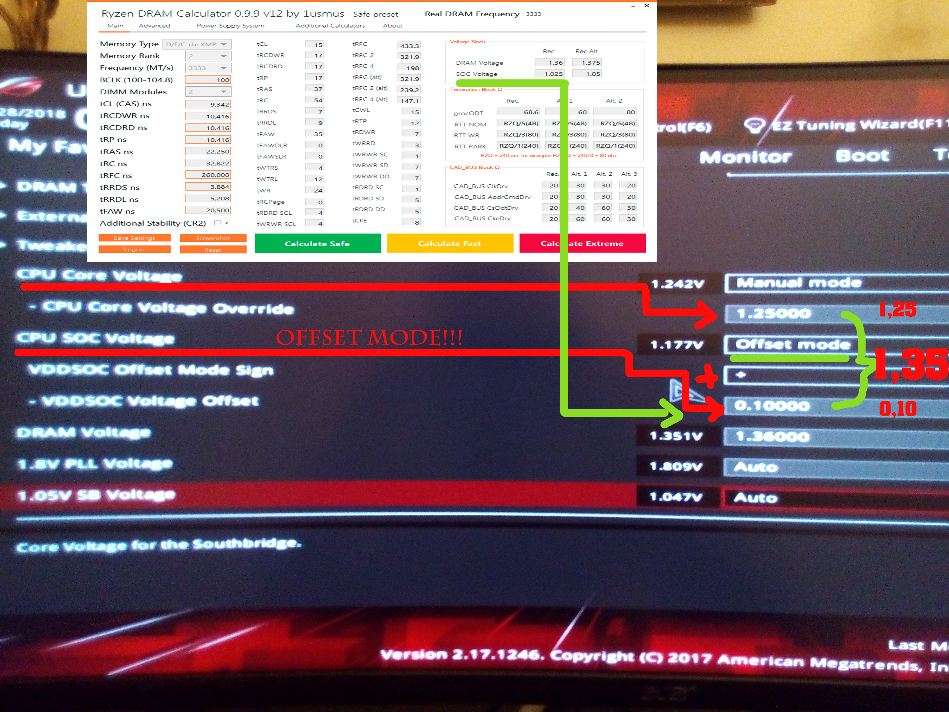 CPU Core Voltage 1.25V при Multipler X38 частота 3800 Mhz + CPU SOC Voltage [Offset Mode] +0.10 V вот если я на Сок поставлю с калькулятора 1,025 Проц не сгорит? получиться же 2,2V? или я не правильно понимаю как работает SOC . как раз Soc не выставлял оставил свой , поэтому похоже память в 3333 MHz ошибками сыпит?
