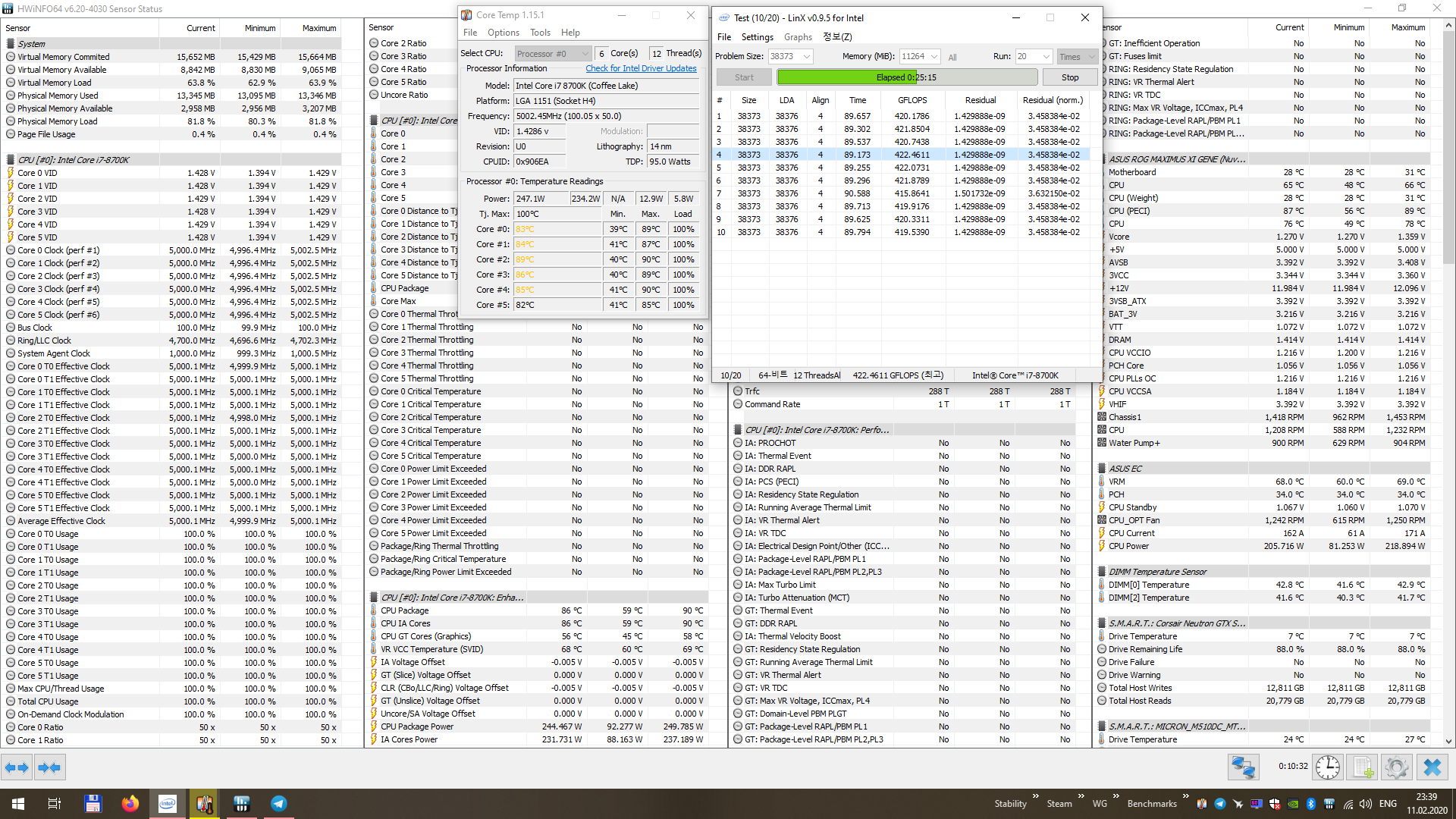 Полученный результат должен иметь следующий вид: Скриншот рабочего стола после прохождения >9 циклов (т.е. между 9 и 10 проходами). Вместе с LinX на рабочем столе должны быть развернуты CPU-Z (первая вкладка) и Core Temp, это обязательный минимум. Такой набор программ даст информацию о напряжении и температурах под нагрузкой-простоем. По желанию можете добавить другие программы, показывающие дополнительную информацию о вашей системе, например третью вкладку CPU-Z, которая покажет модель материнской платы и версию BIOS. Пример результата разгона: Mad Max, 5100 МГц (AVX 0), i7-8086K, HT-ON, Cache 4700, Vcore=1.36V, Batch L805E123, Gigabyte Z370 Aorus Gaming 7 (bios F6), Be Quiet! Dark Rock Pro 4, ЖМ под HS, Windows 10 Pro 64-bit 1809, LinX 0.9.3 64bit.