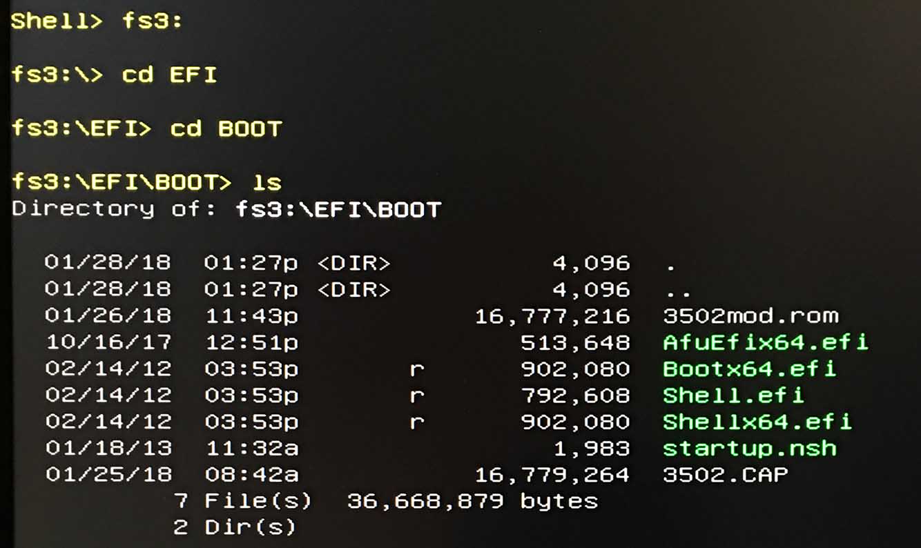 2. Вводим команду fs3: (не забываем про двоеточие) , затем вводим cd EFI , затем cd BOOT и ls. (все аналогично как делали в Прошиваем BIOS от разработчика )
