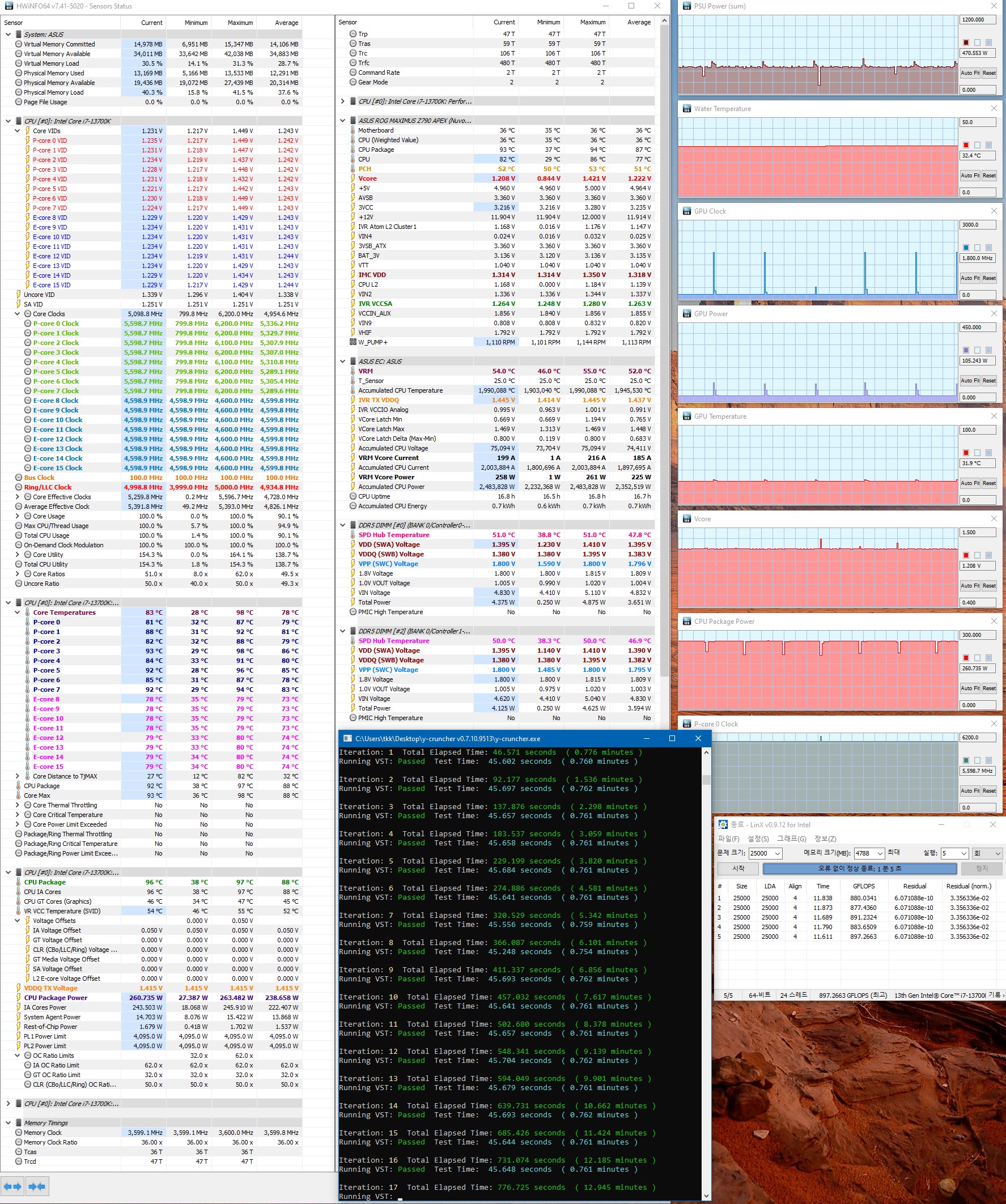 Братцы, нужен бенчмарк. Что имеем: память 8к. Проц в СБР23 на 5.6 ест по VR out 1.19. 5.7 - 1.25. 5.8 - 1.3+- Не гоняю, так как плата мелкая. Прошу поделиться напругами на этих частотах (именно в нагрузке в тесте). Чет мне 1.3 вр аут на 5.8 кажутся запределом((( Проц со старта начинает греться до 95.То есть, с Морой и скальпом еще куда б ни шло, а с моим 360х60 - плохо. Хочу просто пройти на стаб 5.8, и снизить лимит в 360-370 Вт (тогда в СБР24 сброс до 5.7 и приемлемые 90 гр) - чисто чтобы в играх долбило на полную. Но 1.3 В на проц смущают, при этом вкор кажет, конечно, выше на пару соток.