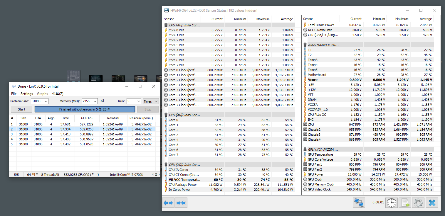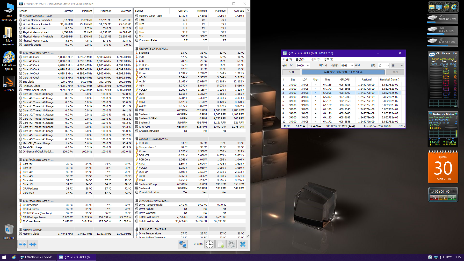 Полученный результат должен иметь следующий вид: Скриншот рабочего стола после прохождения >9 циклов (т.е. между 9 и 10 проходами). Вместе с LinX на рабочем столе должны быть развернуты CPU-Z (первая вкладка) и Core Temp, это обязательный минимум. Такой набор программ даст информацию о напряжении и температурах под нагрузкой-простоем. По желанию можете добавить другие программы, показывающие дополнительную информацию о вашей системе, например третью вкладку CPU-Z, которая покажет модель материнской платы и версию BIOS. Пример результата разгона: Mad Max, 5100 МГц (AVX 0), i7-8086K, HT-ON, Cache 4700, Vcore=1.36V, Batch L805E123, Gigabyte Z370 Aorus Gaming 7 (bios F6), Be Quiet! Dark Rock Pro 4, ЖМ под HS, Windows 10 Pro 64-bit 1809, LinX 0.9.3 64bit.