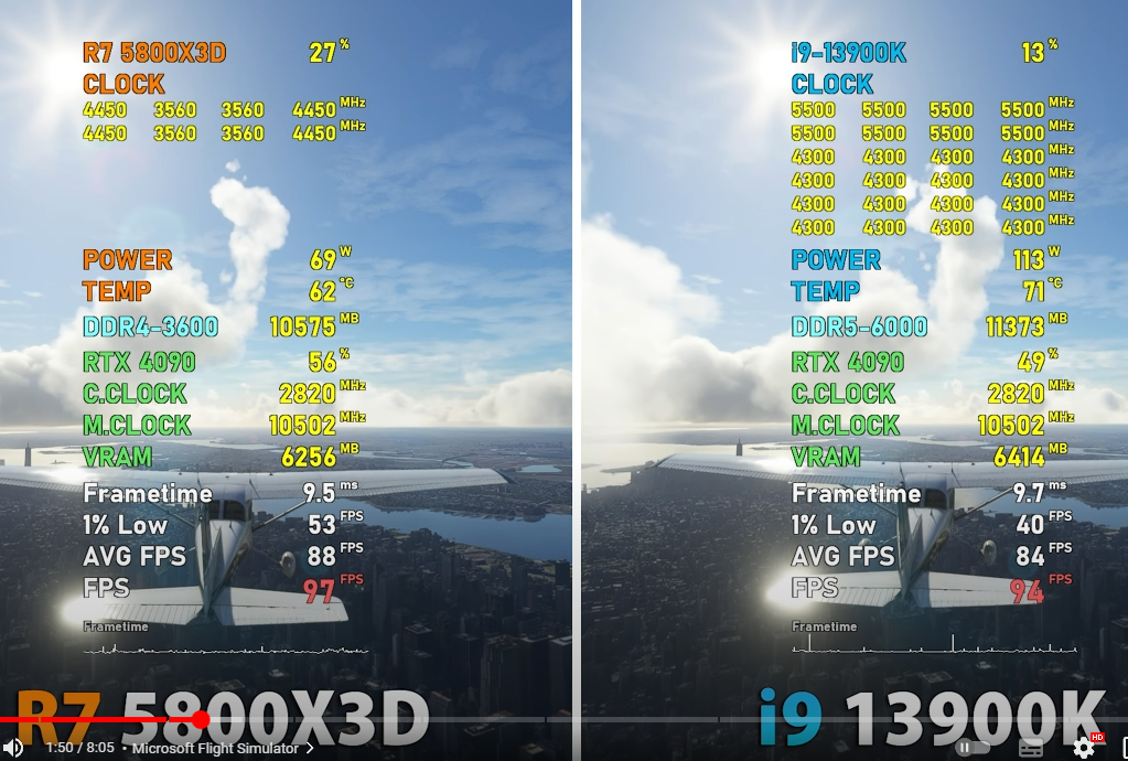 Да про это все в курсе как и про то что в csgo у 13900 800 фпс, а у 5800х3д всего 600, играть невозможно, одни фризы. Покажите в том майкрософт флайт симуляторе 50% победы 13900, над старичком на древней архитектуре. А то пока там преимущество 0 процентов. Выше я скрины кидал. 4400 частота проца, 3600 частота памяти, против 5500 проца и 6000 памяти и я молчу про количество ядер на 5800х3д и 13900. А результаты одинаковые. Все три игры довольно современные. Это еще про разницу в цене мы молчим. доска для 5800х3д в каждом подвале по 5 рублей продается, а новую платформу на 13900 собрать, это сотка минимум.