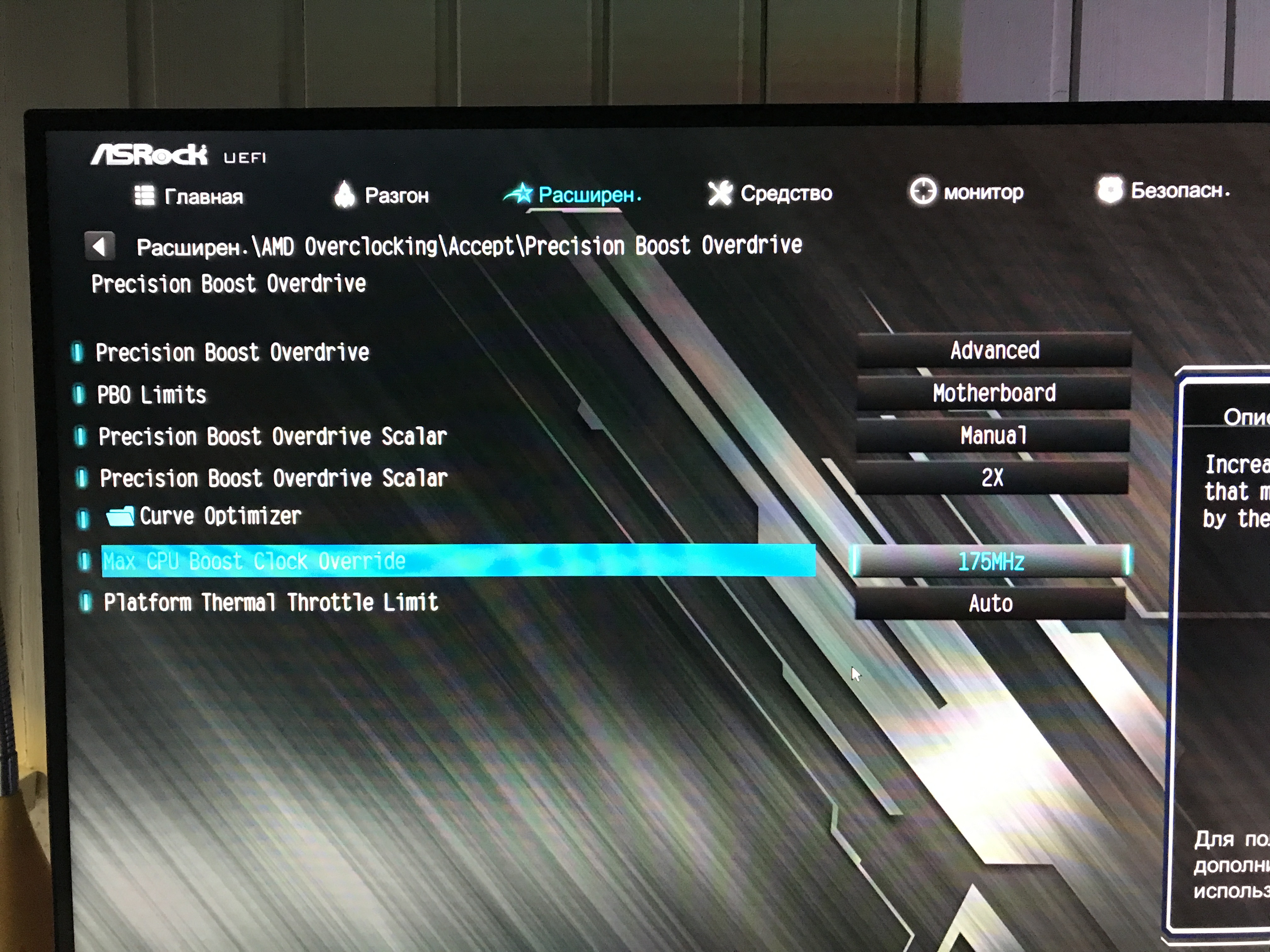 Лично я выставил сразу лимиты по максимуму что может VRM материнки и сколько может переварить охлаждение. Precision Boost Overdrive Scalar чем больше значение, тем позже и менее агрессивно процессор сбрасывает частоты после того как пропала нагрузка. Выставил на максимум. Что касается Load-Line Calibration то для всего кроме VCore выставляю в самое агрессивные значения, хотя и для VCore тоже. Precision Boost берёт во внимание показания именно мониторинга, а не запрашиваемое значение. Мониторинг материнской платы читается Precision Boost`ом через такой протокол как SVI2 TFN. Технология заключается в следующем: 1)выставляем Желаемый VCore Offset, если выставляем его в сторону увеличения, то малопоточная производительность будет выше, если в сторону уменьшения то многопоточная производительность будет выше. Под каждую настройку VCore Offset надо подправлять значения Curve Optimizer, 2)сначала для всех ядер уменьшаем Curve Optimizer, 3)запускаем скрипт, упомянутый выше, повторяем шаг номер 2, пока ни начнёт вываливаться ошибка на одном или нескольких ядрах и откатываемся на один шаг 4)запускаем после этого Cinebench R20, с большой вероятностью система просто перезагрузится, это по большей части лечится добавлением CPU PLL напряжения с 1,8V, но не превышая 1,9V, хотя от чрезмерного напряжения PLL может начаться обратный эффект и стабильность пропадёт, 5)далее начинаем настраивать Curve Optimizer для каждого ядра отдельно и проверяем стабильность как в шагах 3-4.