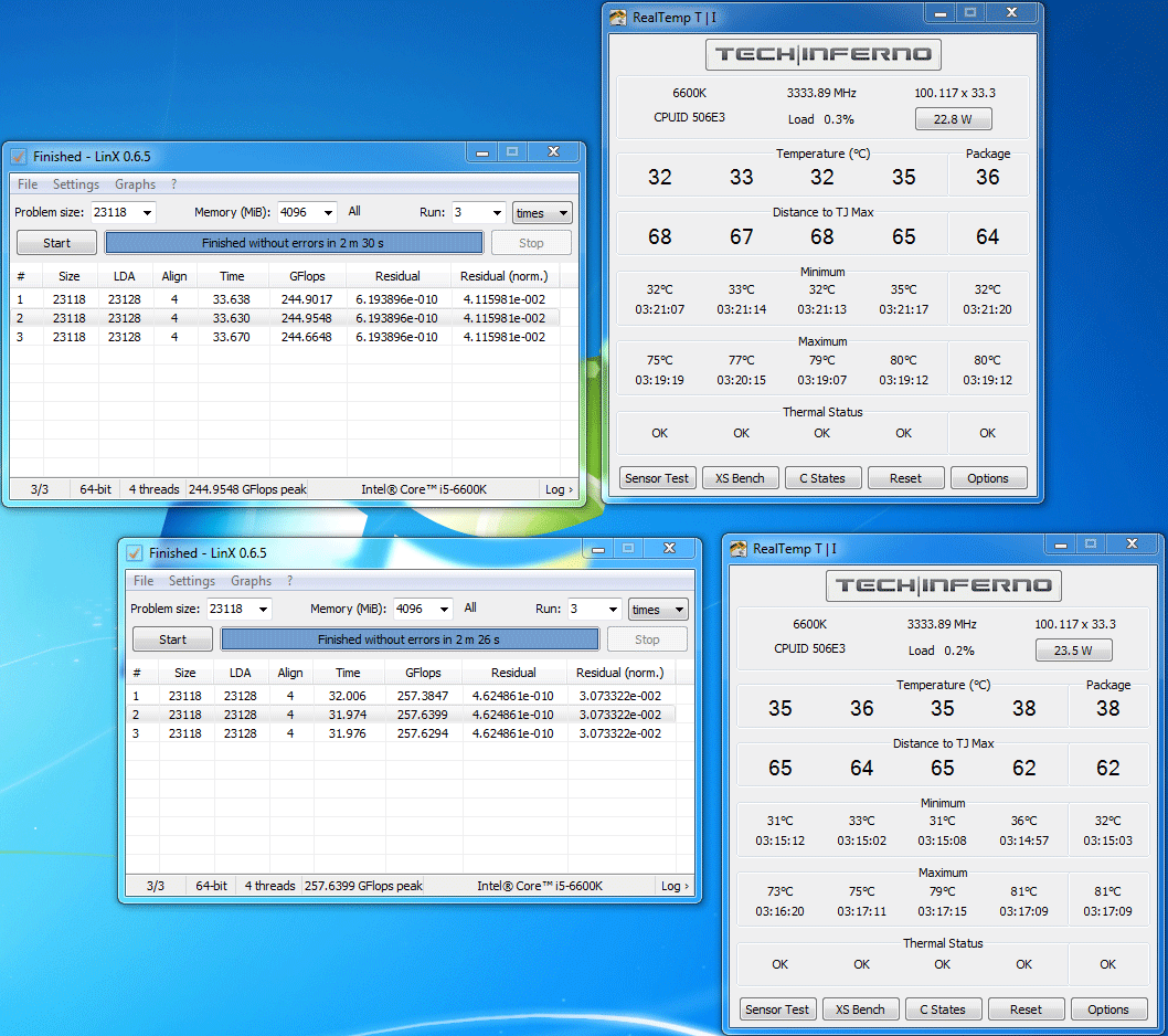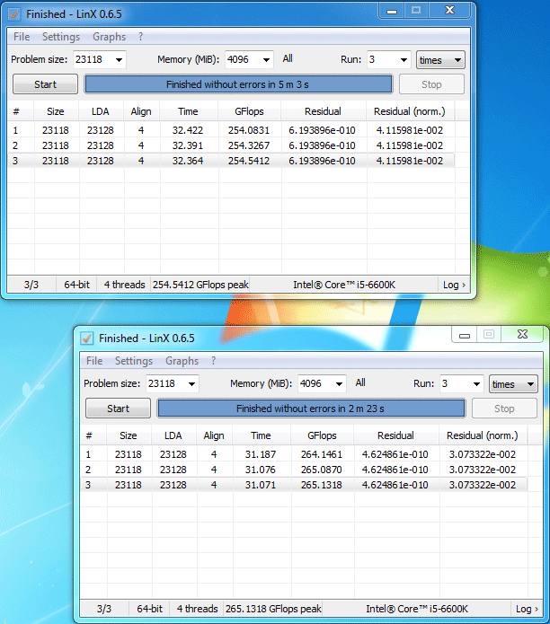 У меня предыдущий линпак, чем который сейчас "кривой" вышел (который не показывает процесс). Вот ссылка: https://yadi.sk/d/tMCWcZ1Jo2kHg Так вот этот предыдущий, он греет точно также, как и новый кривой, но гфлопс выдает чуть меньше - где-то на 10-15 гфлопс (более старые LinX-ы еще меньше выдают). А вот ошибки фиксирует чуть лучше, чем новый. Хотя это может быть и не ошибки он фиксирует вовсе, а просто со скайлейком плохо совместим, оттого и глючит. Вообще рекомендую пользоваться новым, он со скайлейками дружит, хотя и придется вслепую его юзать. Сам на него буду переходить. А как подправят для него оболочку, так и совсем хорошо станет. Ниже на скрине: верхняя пара - это не слишком долгий прогон на "зрячем" LinX (ссылку на который я выложил). Снизу - на новом.