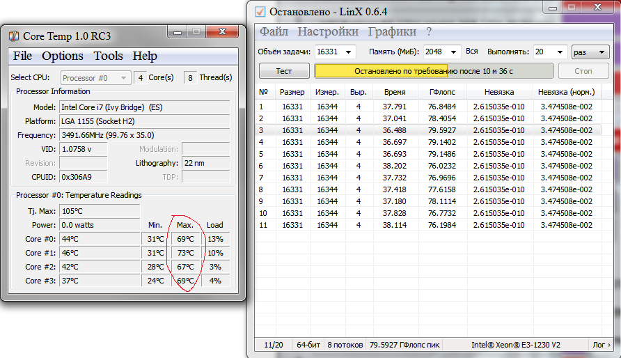 Полёт отличный, запустился с первого раза. BIOS на матерях как у меня v1.1 и v1.0 существуют в единственных экземплярах и сразу же поддерживают E3-1230v2. Кулер выставлен на минимальные обороты, итого ~17db. Процессор греться отказывается.