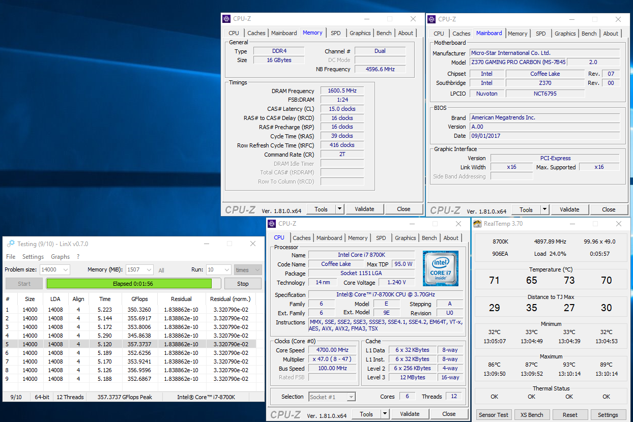 Полученный результат должен иметь следующий вид: Скриншот рабочего стола после прохождения >9 циклов (т.е. между 9 и 10 проходами). Вместе с LinX на рабочем столе должны быть развернуты CPU-Z (первая вкладка) и Core Temp, это обязательный минимум. Такой набор программ даст информацию о напряжении и температурах под нагрузкой-простоем. По желанию можете добавить другие программы, показывающие дополнительную информацию о вашей системе, например третью вкладку CPU-Z, которая покажет модель материнской платы и версию BIOS. Пример результата разгона: Mad Max, 5100 МГц (AVX 0), i7-8086K, HT-ON, Cache 4700, Vcore=1.36V, Batch L805E123, Gigabyte Z370 Aorus Gaming 7 (bios F6), Be Quiet! Dark Rock Pro 4, ЖМ под HS, Windows 10 Pro 64-bit 1809, LinX 0.9.3 64bit.