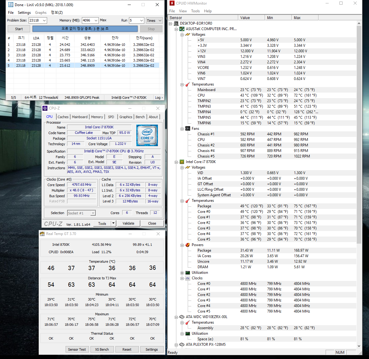 Полученный результат должен иметь следующий вид: Скриншот рабочего стола после прохождения >9 циклов (т.е. между 9 и 10 проходами). Вместе с LinX на рабочем столе должны быть развернуты CPU-Z (первая вкладка) и Core Temp, это обязательный минимум. Такой набор программ даст информацию о напряжении и температурах под нагрузкой-простоем. По желанию можете добавить другие программы, показывающие дополнительную информацию о вашей системе, например третью вкладку CPU-Z, которая покажет модель материнской платы и версию BIOS. Пример результата разгона: Mad Max, 5100 МГц (AVX 0), i7-8086K, HT-ON, Cache 4700, Vcore=1.36V, Batch L805E123, Gigabyte Z370 Aorus Gaming 7 (bios F6), Be Quiet! Dark Rock Pro 4, ЖМ под HS, Windows 10 Pro 64-bit 1809, LinX 0.9.3 64bit.