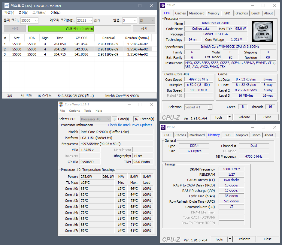 Полученный результат должен иметь следующий вид: Скриншот рабочего стола после прохождения >9 циклов (т.е. между 9 и 10 проходами). Вместе с LinX на рабочем столе должны быть развернуты CPU-Z (первая вкладка) и Core Temp, это обязательный минимум. Такой набор программ даст информацию о напряжении и температурах под нагрузкой-простоем. По желанию можете добавить другие программы, показывающие дополнительную информацию о вашей системе, например третью вкладку CPU-Z, которая покажет модель материнской платы и версию BIOS. Пример результата разгона: Mad Max, 5100 МГц (AVX 0), i7-8086K, HT-ON, Cache 4700, Vcore=1.36V, Batch L805E123, Gigabyte Z370 Aorus Gaming 7 (bios F6), Be Quiet! Dark Rock Pro 4, ЖМ под HS, Windows 10 Pro 64-bit 1809, LinX 0.9.3 64bit.