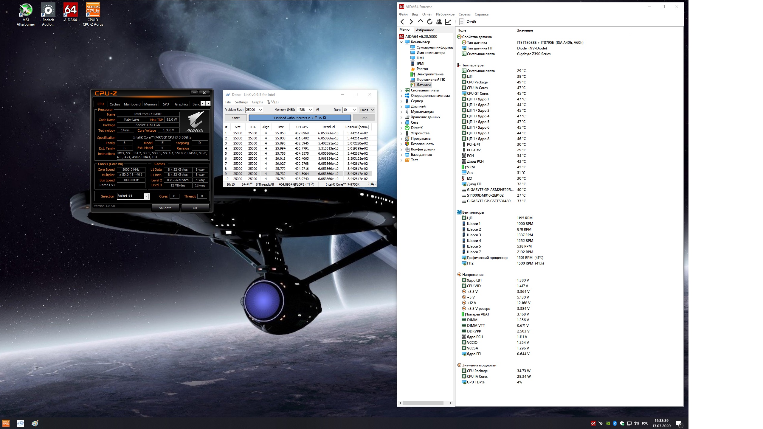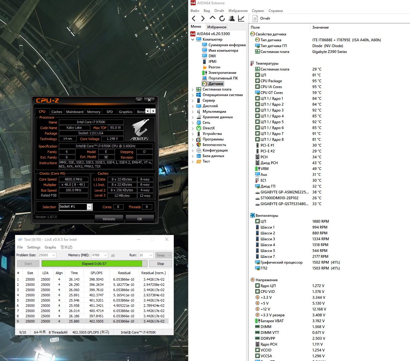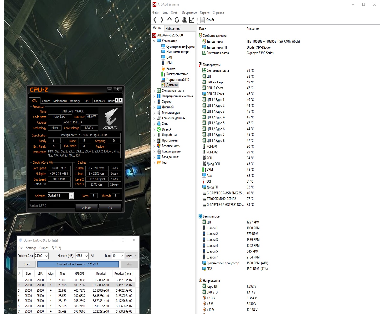 Полученный результат должен иметь следующий вид: Скриншот рабочего стола после прохождения >9 циклов (т.е. между 9 и 10 проходами). Вместе с LinX на рабочем столе должны быть развернуты CPU-Z (первая вкладка) и Core Temp, это обязательный минимум. Такой набор программ даст информацию о напряжении и температурах под нагрузкой-простоем. По желанию можете добавить другие программы, показывающие дополнительную информацию о вашей системе, например третью вкладку CPU-Z, которая покажет модель материнской платы и версию BIOS. Пример результата разгона: Mad Max, 5100 МГц (AVX 0), i7-8086K, HT-ON, Cache 4700, Vcore=1.36V, Batch L805E123, Gigabyte Z370 Aorus Gaming 7 (bios F6), Be Quiet! Dark Rock Pro 4, ЖМ под HS, Windows 10 Pro 64-bit 1809, LinX 0.9.3 64bit.