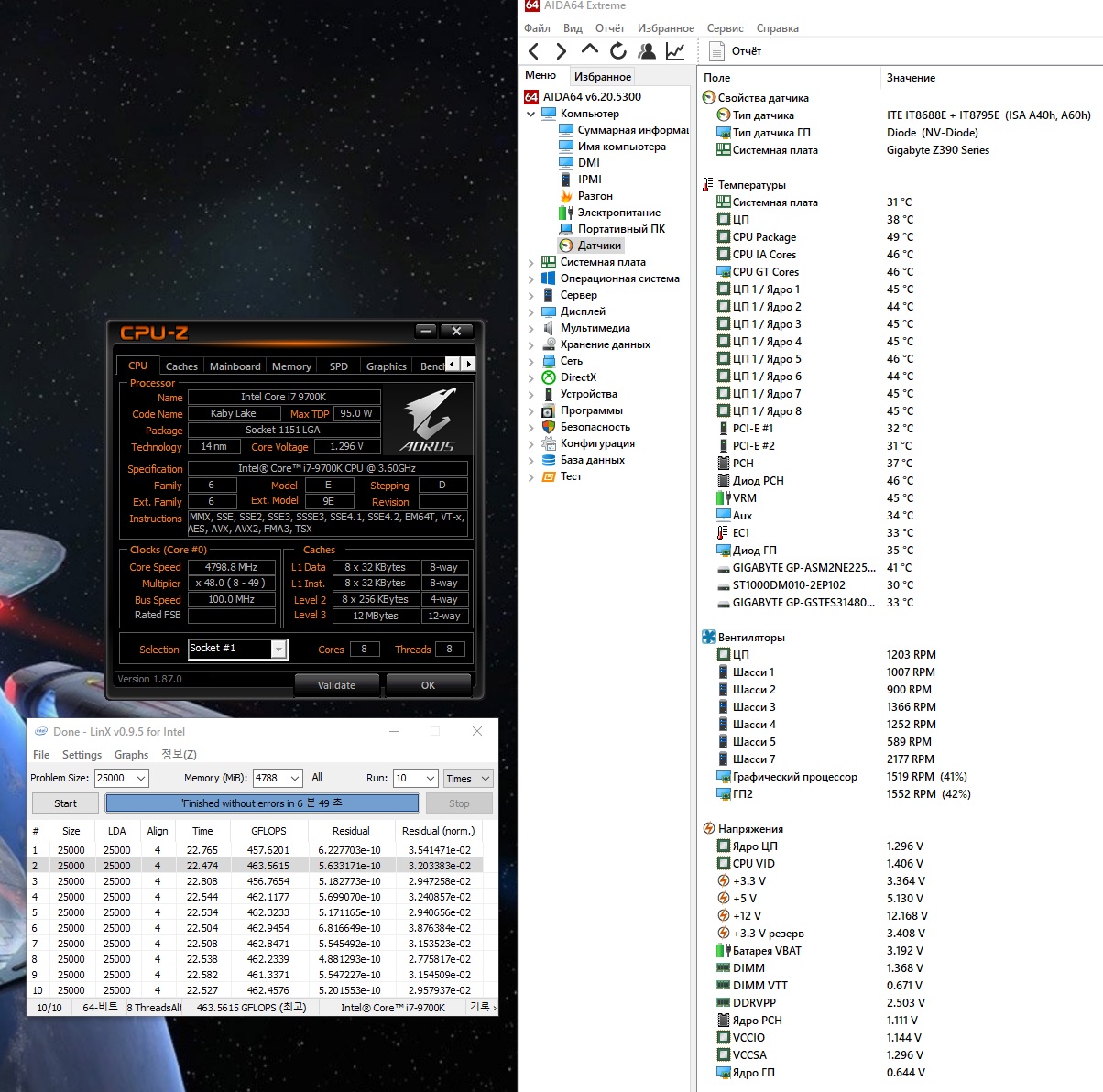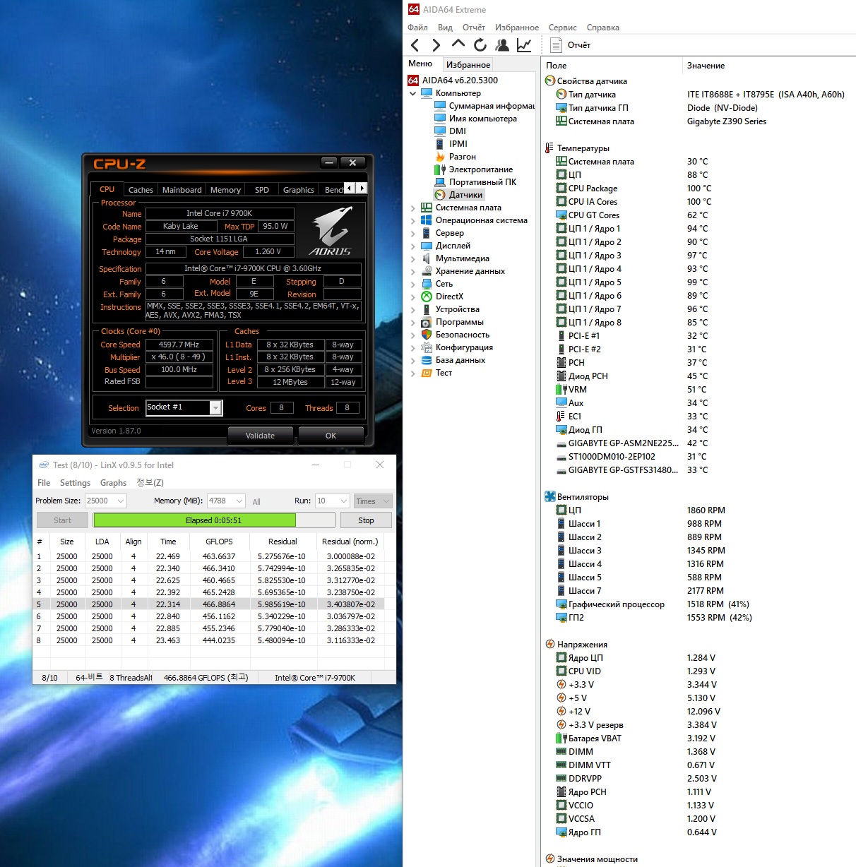 Полученный результат должен иметь следующий вид: Скриншот рабочего стола после прохождения >9 циклов (т.е. между 9 и 10 проходами). Вместе с LinX на рабочем столе должны быть развернуты CPU-Z (первая вкладка) и Core Temp, это обязательный минимум. Такой набор программ даст информацию о напряжении и температурах под нагрузкой-простоем. По желанию можете добавить другие программы, показывающие дополнительную информацию о вашей системе, например третью вкладку CPU-Z, которая покажет модель материнской платы и версию BIOS. Пример результата разгона: Mad Max, 5100 МГц (AVX 0), i7-8086K, HT-ON, Cache 4700, Vcore=1.36V, Batch L805E123, Gigabyte Z370 Aorus Gaming 7 (bios F6), Be Quiet! Dark Rock Pro 4, ЖМ под HS, Windows 10 Pro 64-bit 1809, LinX 0.9.3 64bit.