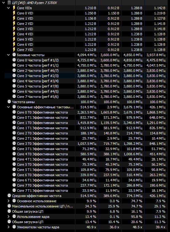 Лично я выставил сразу лимиты по максимуму что может VRM материнки и сколько может переварить охлаждение. Precision Boost Overdrive Scalar чем больше значение, тем позже и менее агрессивно процессор сбрасывает частоты после того как пропала нагрузка. Выставил на максимум. Что касается Load-Line Calibration то для всего кроме VCore выставляю в самое агрессивные значения, хотя и для VCore тоже. Precision Boost берёт во внимание показания именно мониторинга, а не запрашиваемое значение. Мониторинг материнской платы читается Precision Boost`ом через такой протокол как SVI2 TFN. Технология заключается в следующем: 1)выставляем Желаемый VCore Offset, если выставляем его в сторону увеличения, то малопоточная производительность будет выше, если в сторону уменьшения то многопоточная производительность будет выше. Под каждую настройку VCore Offset надо подправлять значения Curve Optimizer, 2)сначала для всех ядер уменьшаем Curve Optimizer, 3)запускаем скрипт, упомянутый выше, повторяем шаг номер 2, пока ни начнёт вываливаться ошибка на одном или нескольких ядрах и откатываемся на один шаг 4)запускаем после этого Cinebench R20, с большой вероятностью система просто перезагрузится, это по большей части лечится добавлением CPU PLL напряжения с 1,8V, но не превышая 1,9V, хотя от чрезмерного напряжения PLL может начаться обратный эффект и стабильность пропадёт, 5)далее начинаем настраивать Curve Optimizer для каждого ядра отдельно и проверяем стабильность как в шагах 3-4.