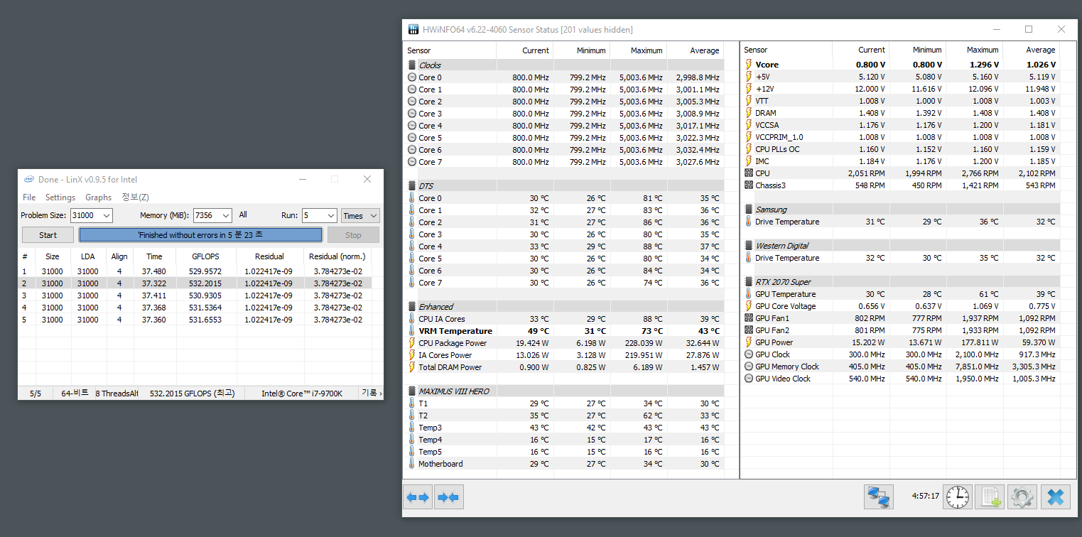 Полученный результат должен иметь следующий вид: Скриншот рабочего стола после прохождения >9 циклов (т.е. между 9 и 10 проходами). Вместе с LinX на рабочем столе должны быть развернуты CPU-Z (первая вкладка) и Core Temp, это обязательный минимум. Такой набор программ даст информацию о напряжении и температурах под нагрузкой-простоем. По желанию можете добавить другие программы, показывающие дополнительную информацию о вашей системе, например третью вкладку CPU-Z, которая покажет модель материнской платы и версию BIOS. Пример результата разгона: Mad Max, 5100 МГц (AVX 0), i7-8086K, HT-ON, Cache 4700, Vcore=1.36V, Batch L805E123, Gigabyte Z370 Aorus Gaming 7 (bios F6), Be Quiet! Dark Rock Pro 4, ЖМ под HS, Windows 10 Pro 64-bit 1809, LinX 0.9.3 64bit.