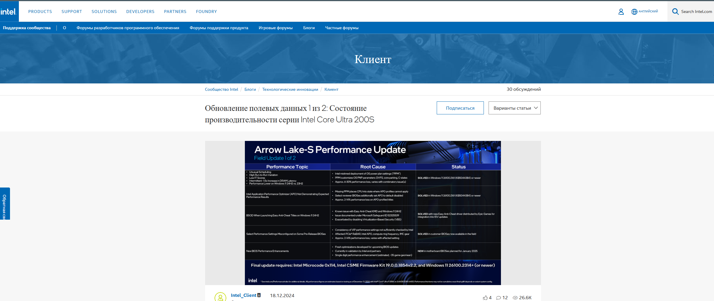 на официальные слайды от Интела Field Update 2 of 2, в которых на второй странице конкретно написано: "Final performance recipe requires Windows 11 26100.2314 (or newer) and a BIOS update containing Intel CSME 19.0.0.1854v2.2"