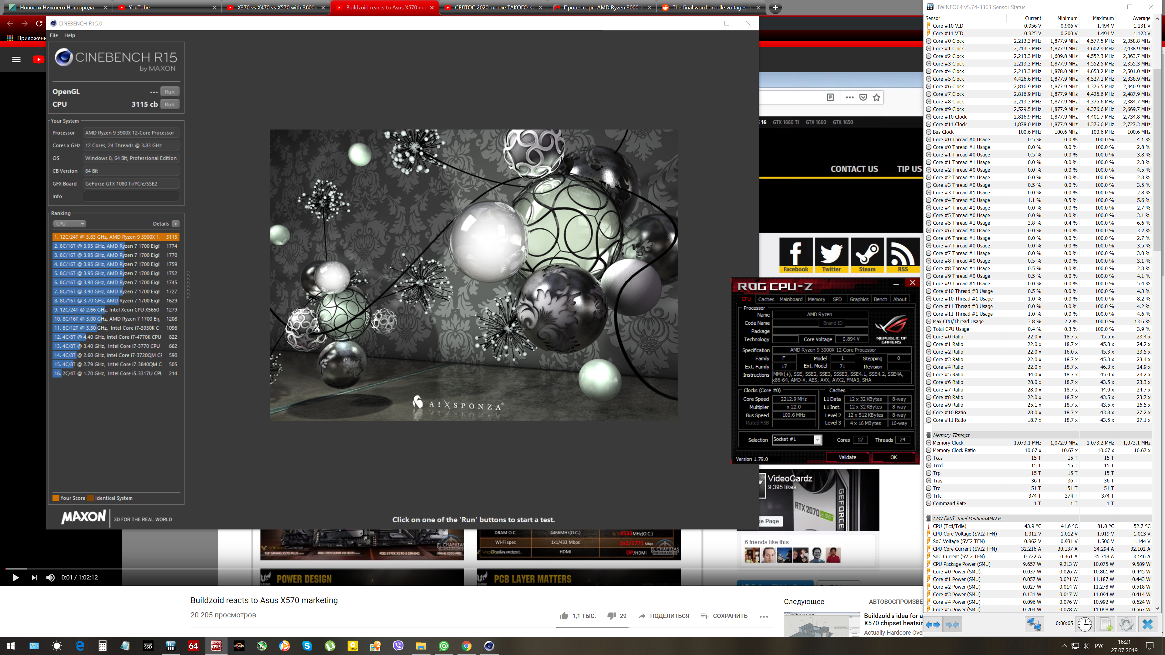 Привет,народ.Сегодня забрал свой новенький 3900Х ОЕМ (успел купить в ДНС за 31799,за что магазину огромное спасибо),поставил его в свою Crosshair 6 Hero (биос 7201),запустился с первого раза без проблем,в биосе пока ничего не ковырял и не отключал,всё в авто,память вообще не трогал,работает на 2133.Первые впечатления-очень горячий,могучий Д15 справляется вроде,но уже впритык,так как в стоке напруга взлетает до 1.4875 вольта,лютых тестов пока не гонял,только синебенч 15 в стоке,просто посмотреть температуры,в таком коротком тесте прогрелся до 81 градуса.Кто спрашивал про заводской буст до 4.6 Ггц -прилагаю скрины,по данным hwinfo даже чуть выше одно ядро бустануло до 4653.2 Мгц,еще несколько других ядер бустили до 4602 в разные моменты времени,так что паспортные данные по факту подтверждаю.Пока больше ничего не делал,буду шаманить дальше,надо настроить вентиляторы корпуса,с памятью поработать в разгон,попробовать фиксированный вольтаж и частоты (не очень доволен температурой в стоке),в общем работы навалом.Главное что запустился и работает на старенькой,но неубиваемой плате