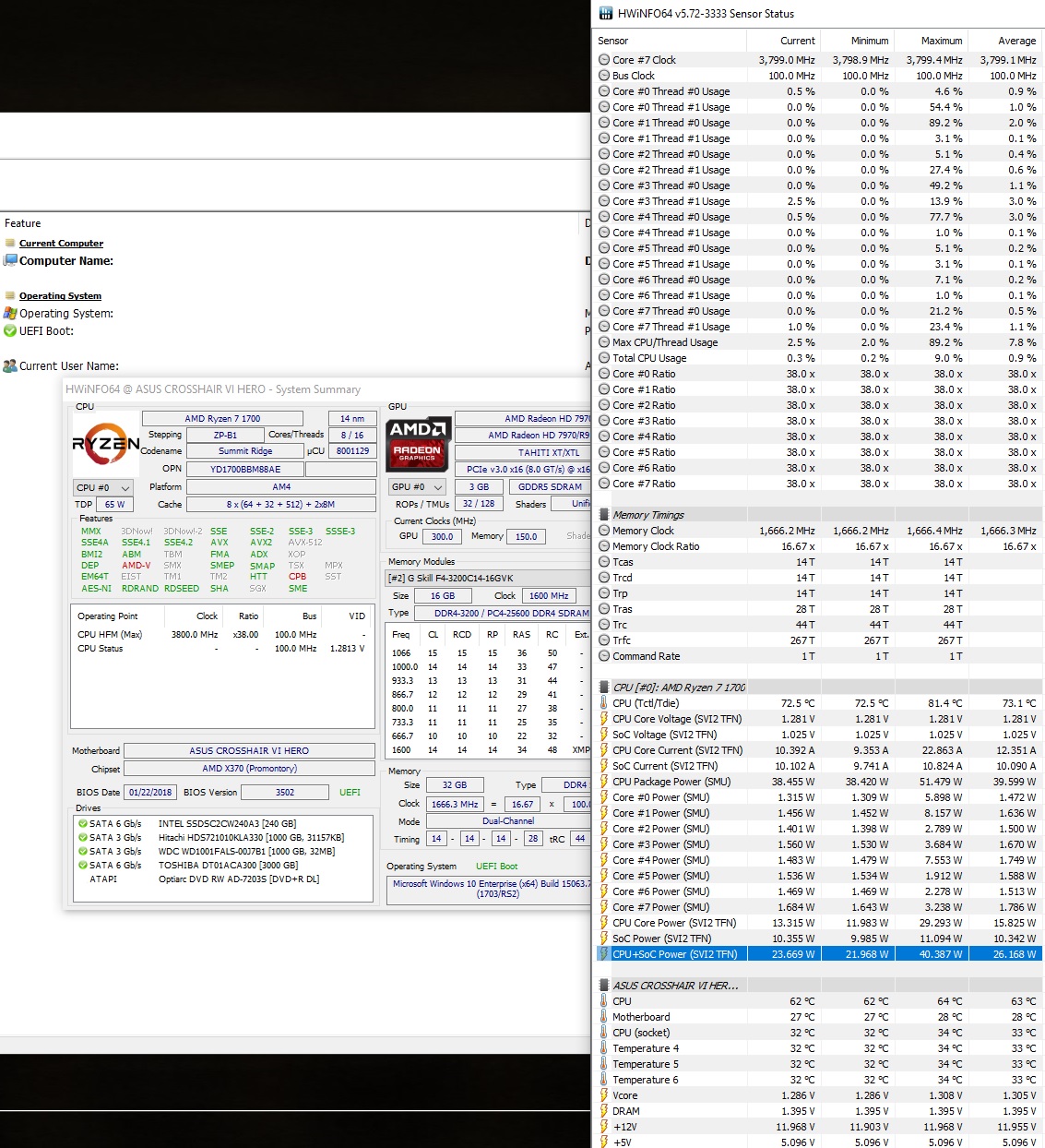 - Обычно поставляется в небольшой коробке без СО. - Штатно имеет базовую частоту 3.4ГГц, частоту 3.5ГГц (технология Turbo Boost) при обычной многопоточной нагрузке (Blender n-cores render) и 3.9ГГц (технологии Precision Boost и XFR) при однопоточной нагрузке (Cinebench R15 single core). - Штатное напряжение питания 1.35В. Может возрастать до 1.4В на отдельных ядрах во время работы Precision Boost и XFR. - Энергоэффективность средняя, требования к СО (TDP) - 95W. Энергопотребление порядка 13Вт в простое и 120Вт в обычной многопоточной нагрузке (Blender n-cores render). - По сравнению с R7 1700 имеет увеличенный промежуток XFR (100МГц вместо 50МГц), а также увеличенные технологией SenseMI показатели температуры на 20 градусов (например, 90 при реальных 70).