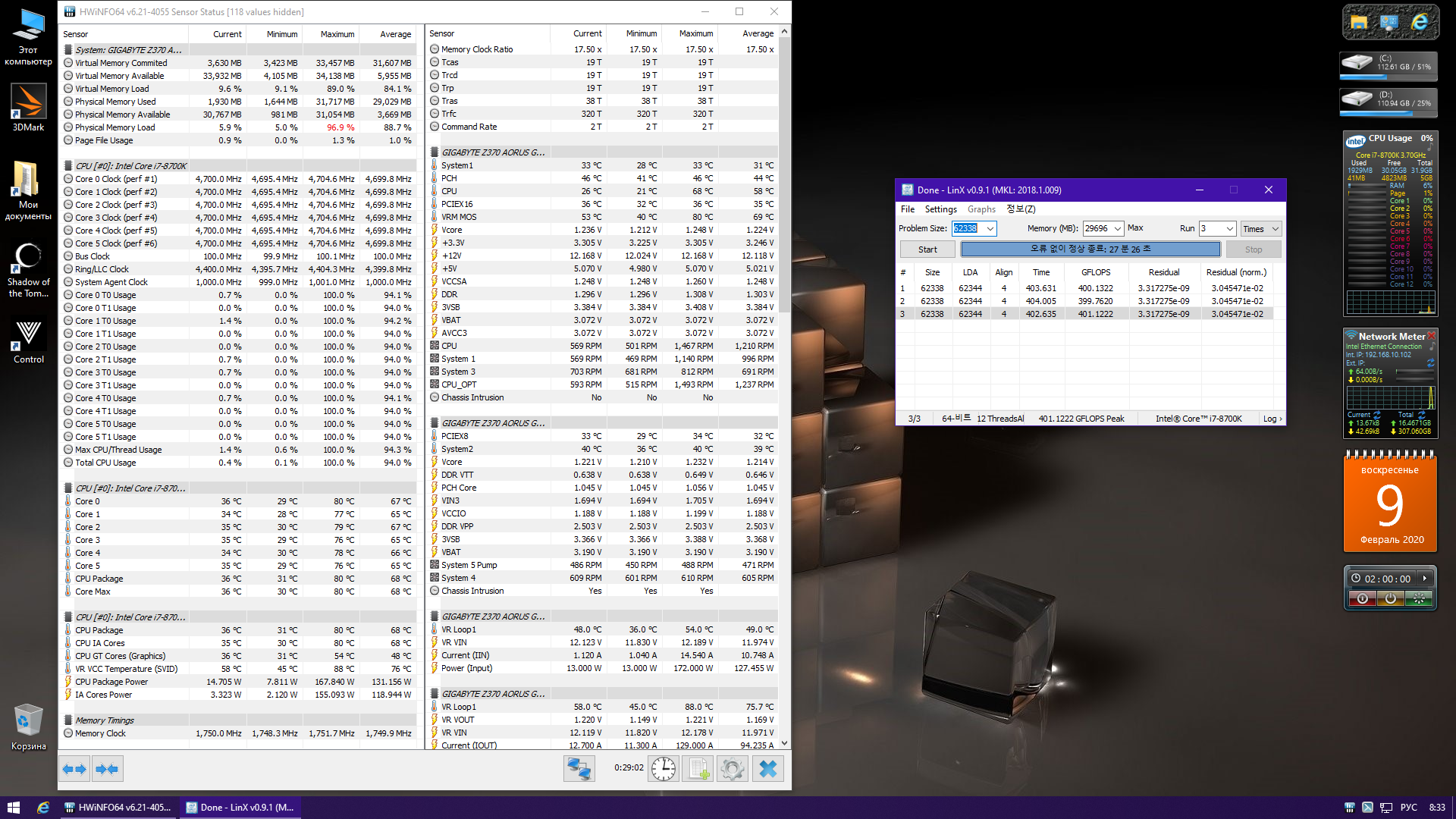Полученный результат должен иметь следующий вид: Скриншот рабочего стола после прохождения >9 циклов (т.е. между 9 и 10 проходами). Вместе с LinX на рабочем столе должны быть развернуты CPU-Z (первая вкладка) и Core Temp, это обязательный минимум. Такой набор программ даст информацию о напряжении и температурах под нагрузкой-простоем. По желанию можете добавить другие программы, показывающие дополнительную информацию о вашей системе, например третью вкладку CPU-Z, которая покажет модель материнской платы и версию BIOS. Пример результата разгона: Mad Max, 5100 МГц (AVX 0), i7-8086K, HT-ON, Cache 4700, Vcore=1.36V, Batch L805E123, Gigabyte Z370 Aorus Gaming 7 (bios F6), Be Quiet! Dark Rock Pro 4, ЖМ под HS, Windows 10 Pro 64-bit 1809, LinX 0.9.3 64bit.