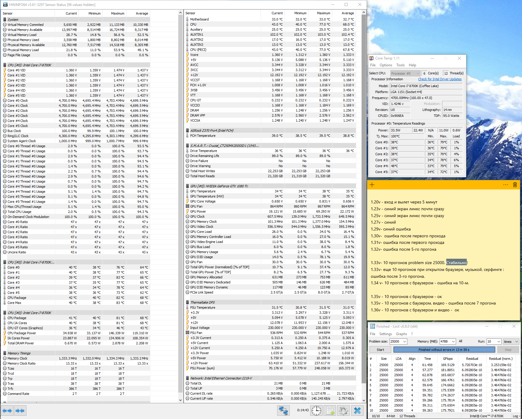 Картина такая [linX 0.8.0]: 1.20v - вход и вылет через 5 минут 1.23v - линкс, синий экран почти сразу 1.25v - линкс, синий экран почти сразу 1.27v - синий 1,29v- линкс, ошибка, синий 1.31v- ошибка после первого прохода 1.32v- ошибка после 5-го прогона 1.33v- 10 прогонов problem size 25000. Стабильно! 1.33v- еще 10 прогонов при открытом браузере, музыкой, серфинге : ошибка после 3-го прогона. 1.34v- 10 прогонов с браузером - ошибка на 10-м. 1.35v - 10 прогонов с браузером - ок 1.35v - 10 прогонов с баузером, видео - ошибка после 7 прогона ========================================== 1.36v - 10 прогонов с браузером и видео - ок 1.36v - 10 прогонов с Furmark - ок [хотя зря может быть, т.к. furmark мешает линпаку скорее всего, но зато мульти-нагрузка] ===================================