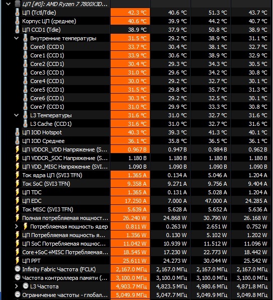 Всем привет. Поделитесь инфой по вашим 7800x3d для сравнения. У меня во-первых температура ЦП, корпуса ЦП и ядер очень сильно различается. Во-вторых проц очень сильно греется в простое или с минимальный нагрузкой. Работает с PBO -28, охлаждается NZXT ((kraken)) x73, помпа 1200 оборотов, вентили 600. Пробовал поднимать обороты до максимальных - 0 разницы. На скрине ниже результат после включения, 52-55 градусов. Потом может прогреться до 60 и скакать до 70 просто при браузинге в 1-2 вкладки. При этом в играх греется несильно, WOW - 58-62 градуса, Hogwarts Legacy 64-65. Это норма или стоит беспокоиться? На 7700х примерно также было, даже чуть хуже.