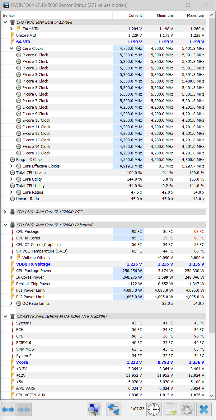 Я хз как вы уложили стоковые 5,3 в 1.208 вольт в прайме. Может у меня процессор мусор просто? Смотрите скрины. Один скрин это Adaptive Offset -0.05 с LLC=4 вроде, забыл, или 5, не суть. Без включенного LLC прайм крашился. Второй скрин я руками уже попробовал докрутить до ваших значений, ну так сходу с лету лучшее, что смог поиметь, это 1,23 + LLC=7. LCC = 6 в ручном режиме дает легкую просадку, в LLC = 7 дает легкий овервольт, выбрал 7. Лимиты на 250. Прайм поехал. Но посмотрите на частоты. Почему у вас все это в лимиты 250(на вашем скрине даже 240 влезает), а у меня нет?