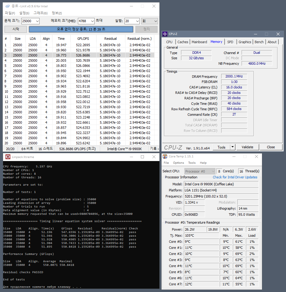 Полученный результат должен иметь следующий вид: Скриншот рабочего стола после прохождения >9 циклов (т.е. между 9 и 10 проходами). Вместе с LinX на рабочем столе должны быть развернуты CPU-Z (первая вкладка) и Core Temp, это обязательный минимум. Такой набор программ даст информацию о напряжении и температурах под нагрузкой-простоем. По желанию можете добавить другие программы, показывающие дополнительную информацию о вашей системе, например третью вкладку CPU-Z, которая покажет модель материнской платы и версию BIOS. Пример результата разгона: Mad Max, 5100 МГц (AVX 0), i7-8086K, HT-ON, Cache 4700, Vcore=1.36V, Batch L805E123, Gigabyte Z370 Aorus Gaming 7 (bios F6), Be Quiet! Dark Rock Pro 4, ЖМ под HS, Windows 10 Pro 64-bit 1809, LinX 0.9.3 64bit.
