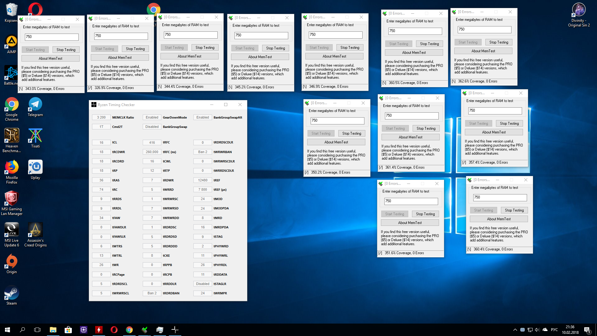 ...Пробовал прогонять в Linx 6Gb 10 проходов, memtest86 (одна из последних версий с долгим проходом), testmem 5, OCCT (около 30 мин), AIDA 64 стресс тест - все эти тесты проходят без ошибок. В некоторых использовал для HWInfo - было все ок, за исключением одного случая - при понижении напряжения на CPU на 0.1В выскочила ошибка в кеше L2. Связываю ее с заниженным напряжением. На данный момент стоит последняя версия биос (проблемы были всегда и старыми биосами), настройки по дефолту за исключением XMP профиля плашек на 2666. Драйвера все скачены с сайта производителя. ...