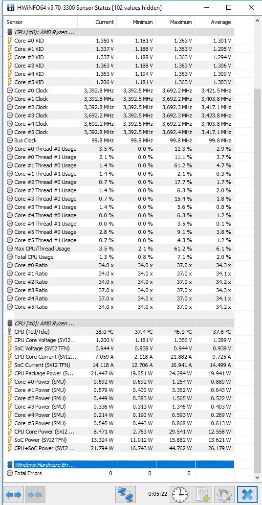 - Обычно поставляется в коробке с системой охлаждения Wraith Spire RGB (это круглая конструкция из целого куска алюминия с медной вставкой-испарительной камерой в основании и вентилятором с кольцом разноцветной подсветки, крепится к задней пластине разъёма AM4 четырьмя винтами). - Штатно имеет базовую частоту 3.0ГГц, частоту 3.2ГГц (технология Turbo Boost) при обычной многопоточной нагрузке (Blender n-cores render) и 3.75ГГц (технологии Precision Boost и XFR) при однопоточной нагрузке (Cinebench R15 single core). - Штатное напряжение питания 1.1875В. Может возрастать до 1.3В на отдельных ядрах во время работы Precision Boost и XFR. - Очень энергоэффективный, требования к СО (TDP) - всего 65W. Энергопотребление порядка 10Вт в простое и 85Вт в обычной многопоточной нагрузке (Blender n-cores render).