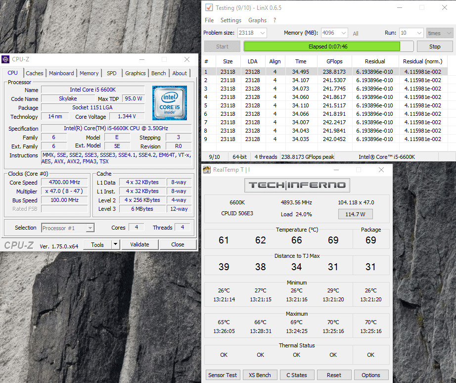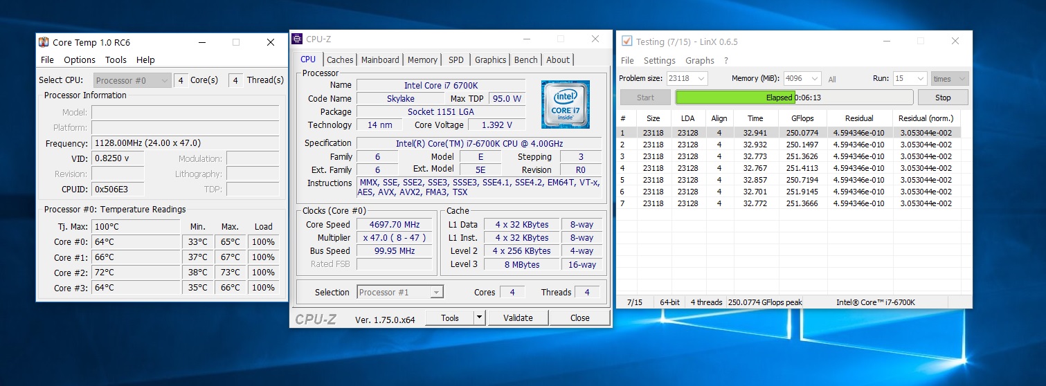 Пощупал свой 6700K на скальпе и воде на 4700MHz. Примерно плюс 0.10-0,12B от напряжения для 4500MHZ и плюс 10-11С по самому горячему ядру. Ниже два скрина, с HT ON и HT OFF. Очередной раз замечаю, что с HT OFF все немного горячее при том же напряжении. И да - скальпированному скайлайку вода не нужна