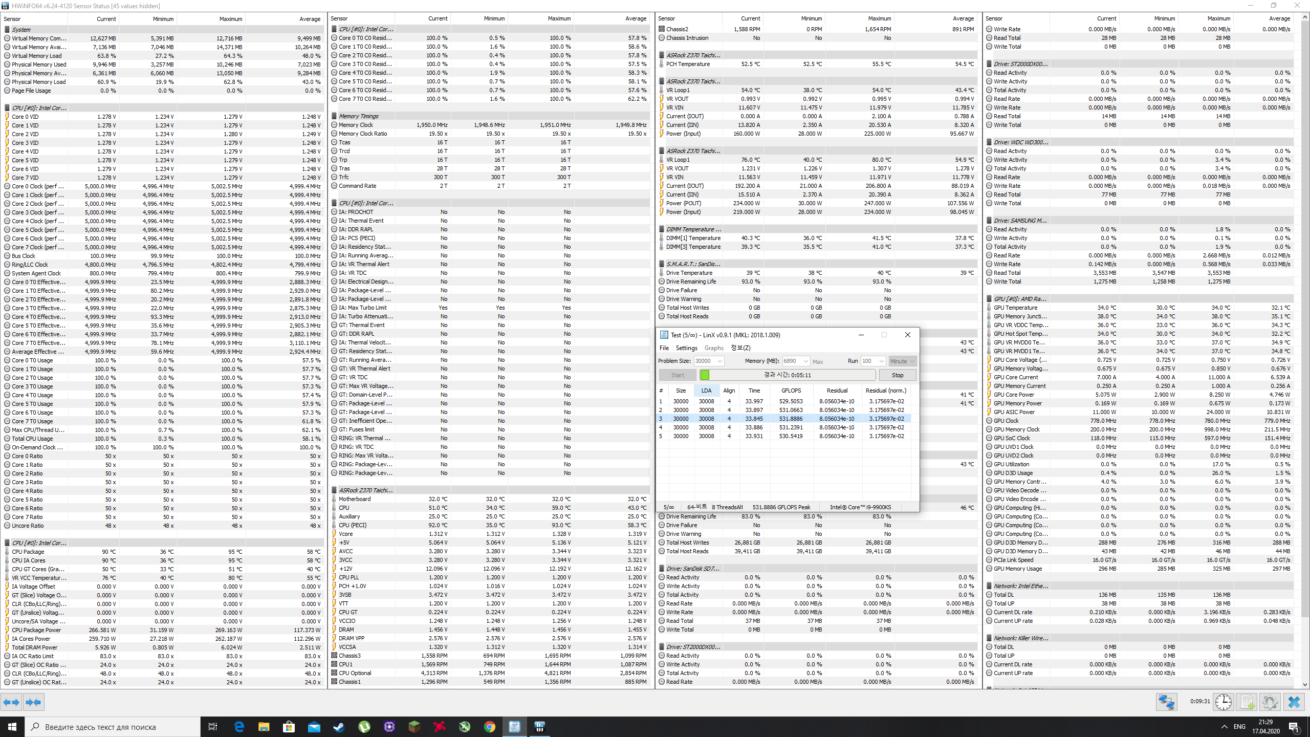 Полученный результат должен иметь следующий вид: Скриншот рабочего стола после прохождения >9 циклов (т.е. между 9 и 10 проходами). Вместе с LinX на рабочем столе должны быть развернуты CPU-Z (первая вкладка) и Core Temp, это обязательный минимум. Такой набор программ даст информацию о напряжении и температурах под нагрузкой-простоем. По желанию можете добавить другие программы, показывающие дополнительную информацию о вашей системе, например третью вкладку CPU-Z, которая покажет модель материнской платы и версию BIOS. Пример результата разгона: Mad Max, 5100 МГц (AVX 0), i7-8086K, HT-ON, Cache 4700, Vcore=1.36V, Batch L805E123, Gigabyte Z370 Aorus Gaming 7 (bios F6), Be Quiet! Dark Rock Pro 4, ЖМ под HS, Windows 10 Pro 64-bit 1809, LinX 0.9.3 64bit.