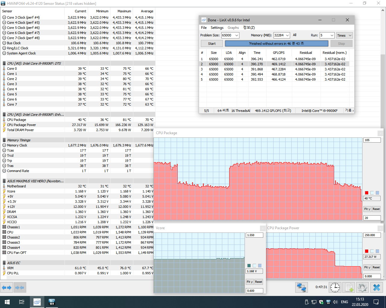 Предельные значения температуры и энергопотребления разогнанного Intel Core i7-9700K при прохождении тестирования в Prime95 29.4 (при полной восьмипоточной нагрузке SmallFFT c AVX, охлаждение Corsair Hydro Series H115i)