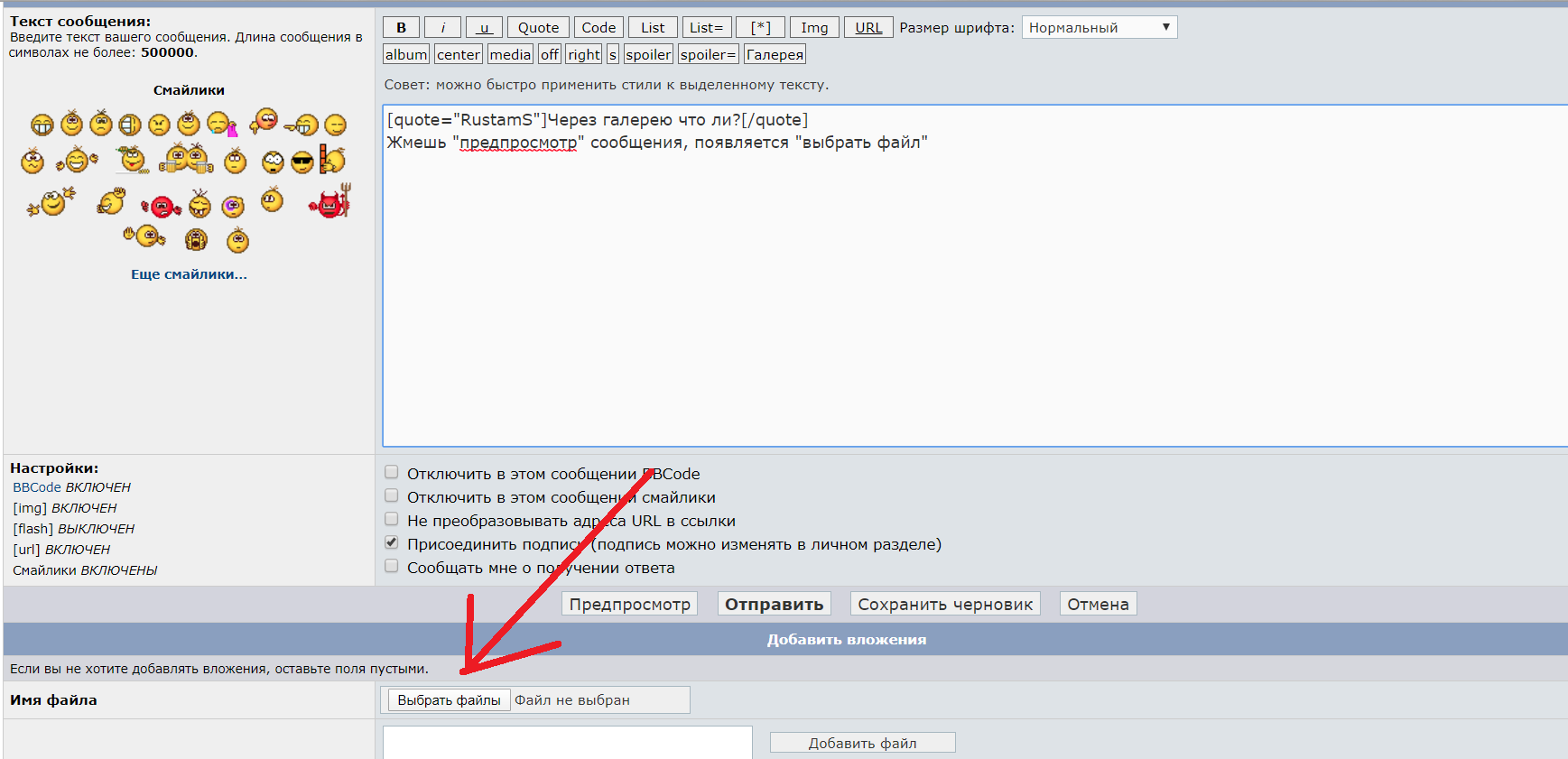 1. Выбрать файл -> 2. Предосмотр -> 3. Вставить в текст сообщения Вложение: