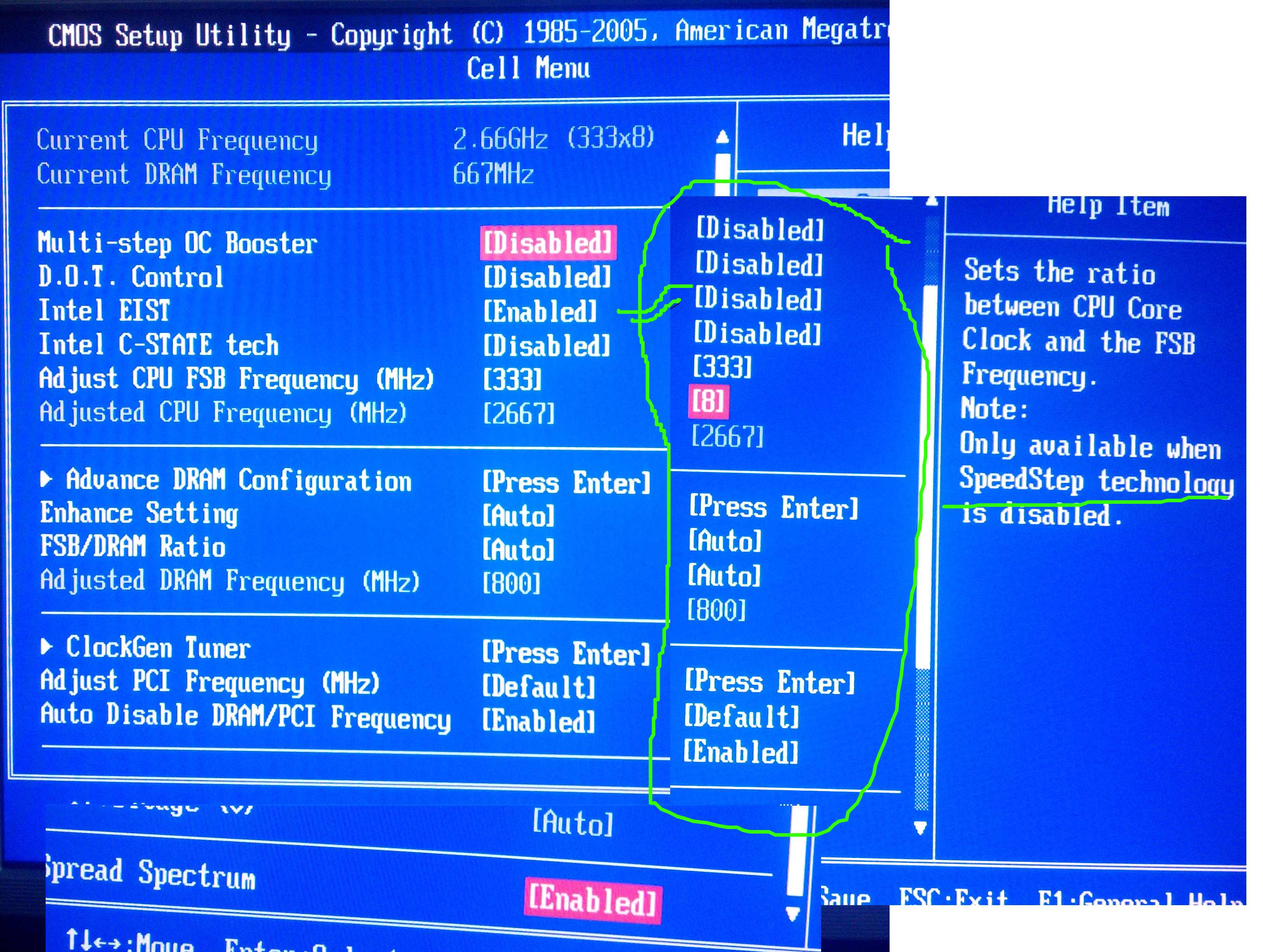 так вопрос открыт остался... множитель 8 вместо 9,5 и имя промелькивает E а не X? выяснить надо... какой проц сейчас стоит... до этого был q8800// при отключении EIST появляется множитель. при наведении на множитель написано справа (можешь наблюдать) , что доступен только при степ спид отключенном, как я понимаю, он включен, чтобы изменить множитель, надо выключить его