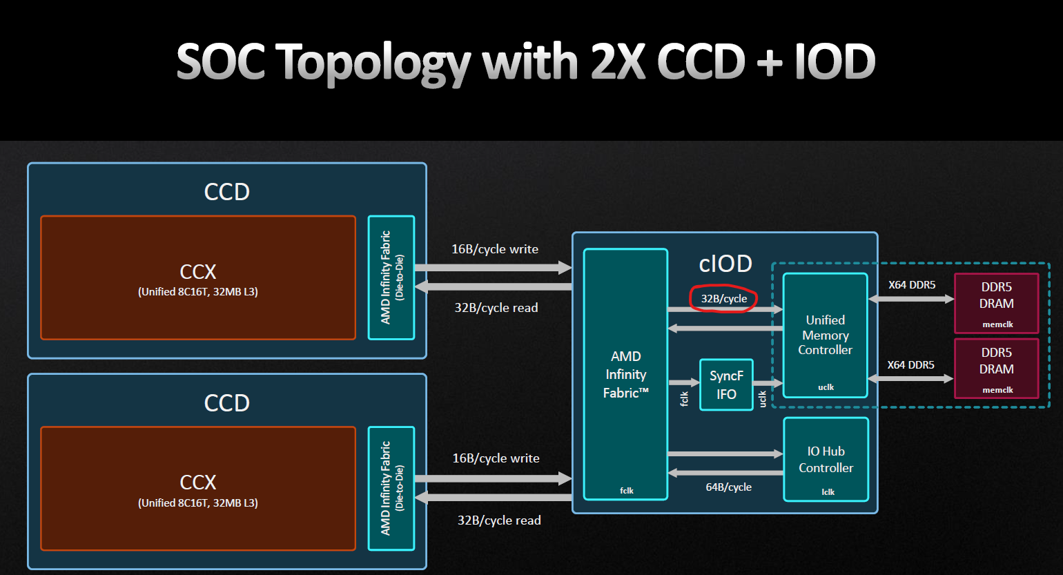 это не потоки, а ширина шины. Она имеет ширину в 32 полезных байта отIOD к CCD. Соответственно, у двух CCD получится 2*32=64 байта. Затем умножаем 64 байта на количество тактов шины в секунду, например FCLK=2100МГц, и получаем 2100*64 = 134400 МБ/с - это то количество данных, которое может прокачивать шина от IOD к ядрам. У нее нет никаких таймингов как у памяти, а сама с собой и с L3 она синхронизирована, поэтому на каждом такте она всегда может прокачивать по 32 байта к CCD. Если получается меньше, то эти данные до шины просто не дошли. А если не дошли, то упор, очевидно, не в шину.