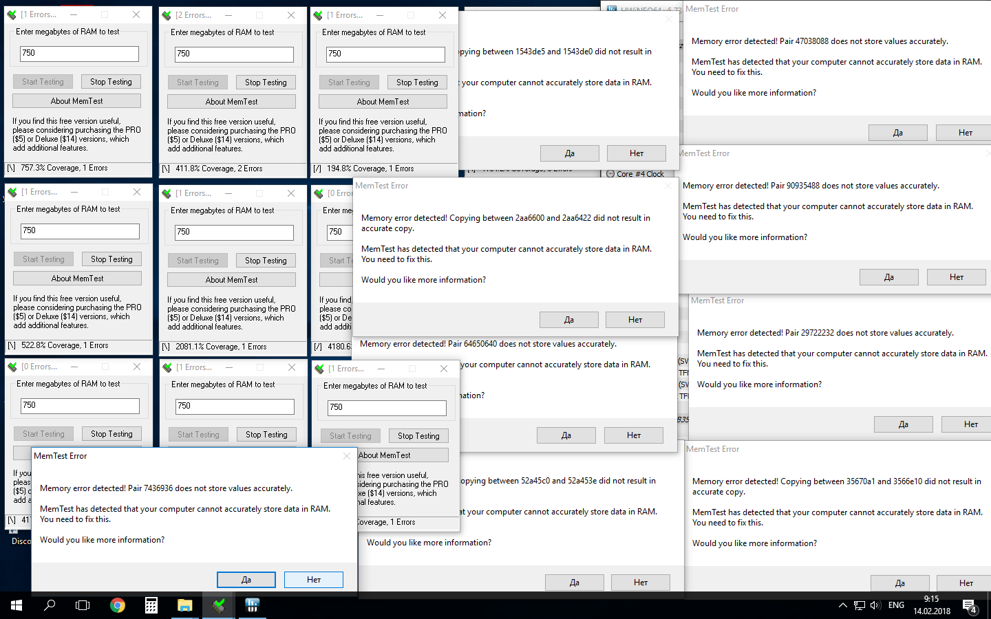 Решил протестировать стабильность и получаются такие результаты: LinX v0.7.0 6Gb 50 прогонов без ошибок, TestMem5 20 прогонов без ошибок, HCI MemTest 6 выдает кучу ошибок до 100%. Встает вопрос о стабильности, но мне не хочется бездумно менять параметры памяти, чтобы не завалить другие тесты. В чем может быть дело и как это вылечить?