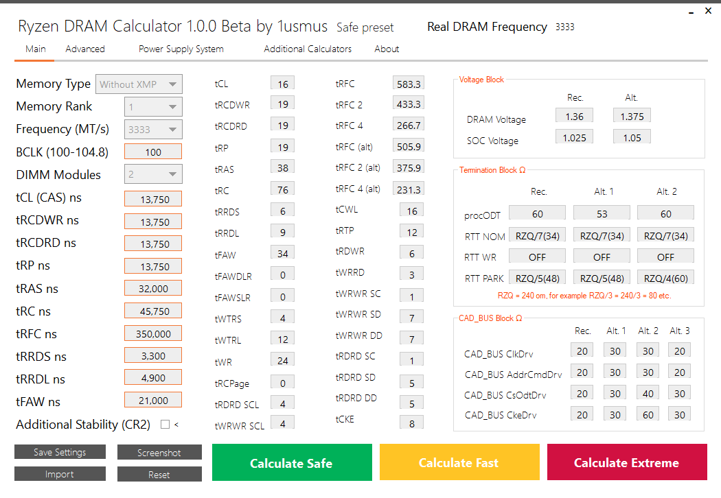Память легко взяла @3200 с настройками из калькулятора, но я решил пойди дальше и взял @3466. Настройки калькулятора были не стабильны и я ручной настройкой вывел систему на стабильную работу. Но с этим посыпались результаты в AIDA64, а именно Memory Latency, L2 Copy, L3 Latency и иногда L3 Write и Copy. Вообще тест AIDA64 выдает очень нестабильные результаты, его приходится проводить по 3-4 раза и усреднять значения. Было решено откатится на @3333 и воспользоваться настройками из калькулятора пресет Safe.